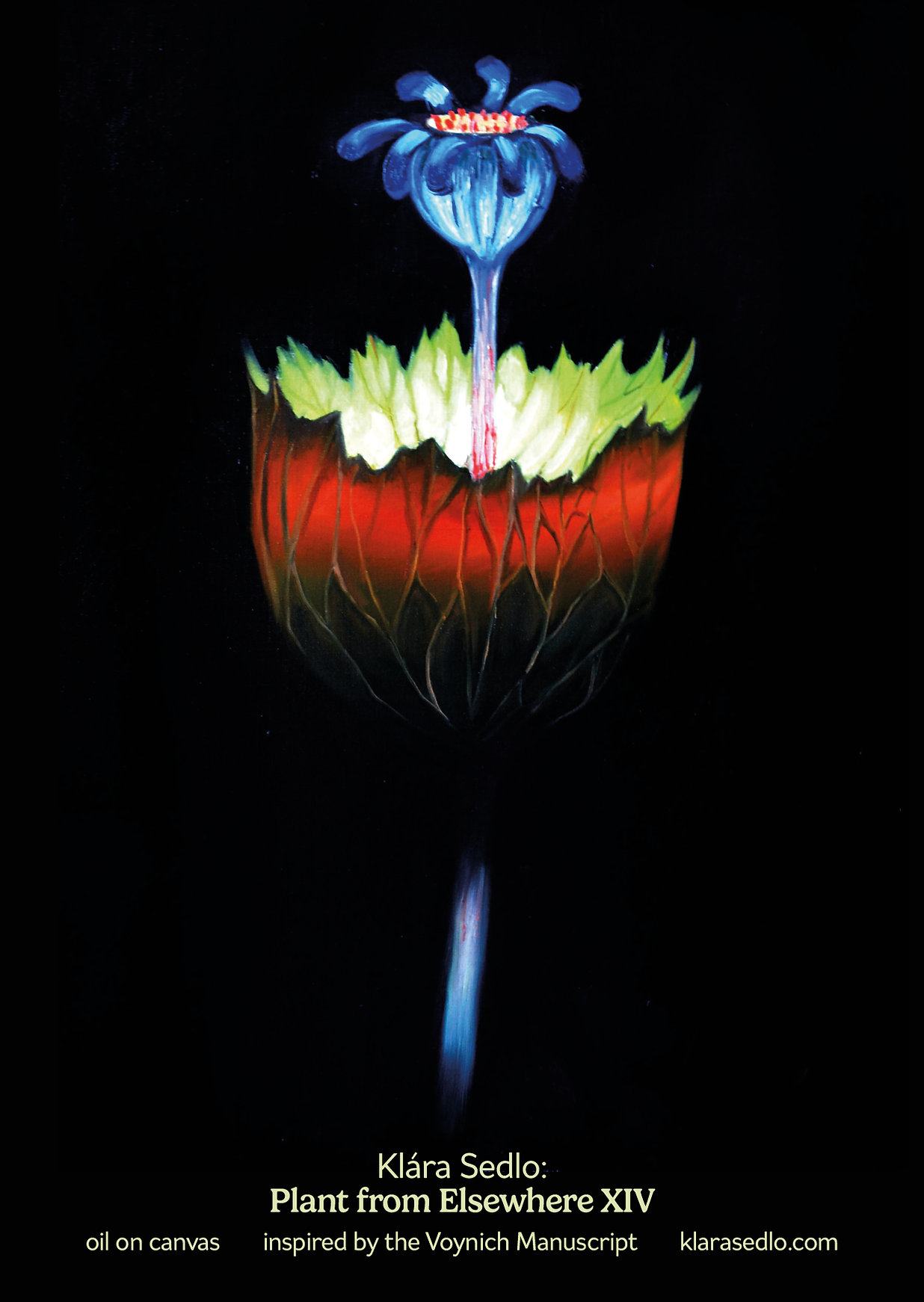 Postcard with a motif of a painting by Klára Sedlo, inspired by the famous Voynich manuscript - a mysterious medieval book full of unknown symbols and fantastic plants, the meaning of which remains unclear to this day.