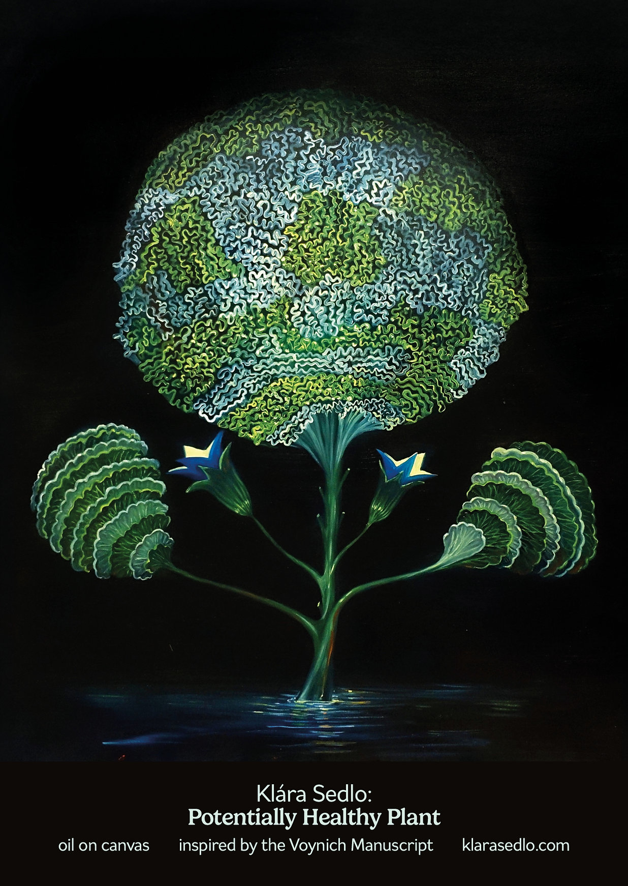 Postcard with a motif of a painting by Klára Sedlo, inspired by the famous Voynich manuscript - a mysterious medieval book full of unknown symbols and fantastic plants, the meaning of which remains unclear to this day.