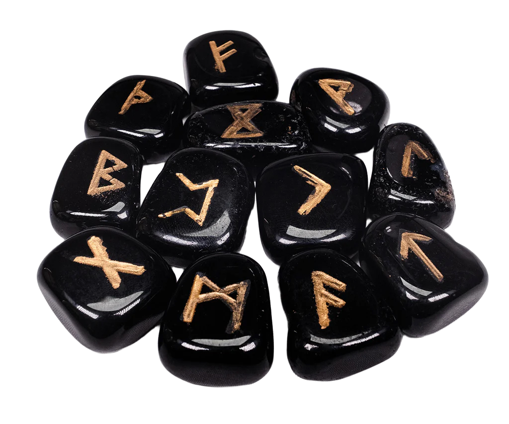 Regeneration, trust, concentration. These twenty-five runes are incised on polished agate, a semi-precious intense green-veined stone.