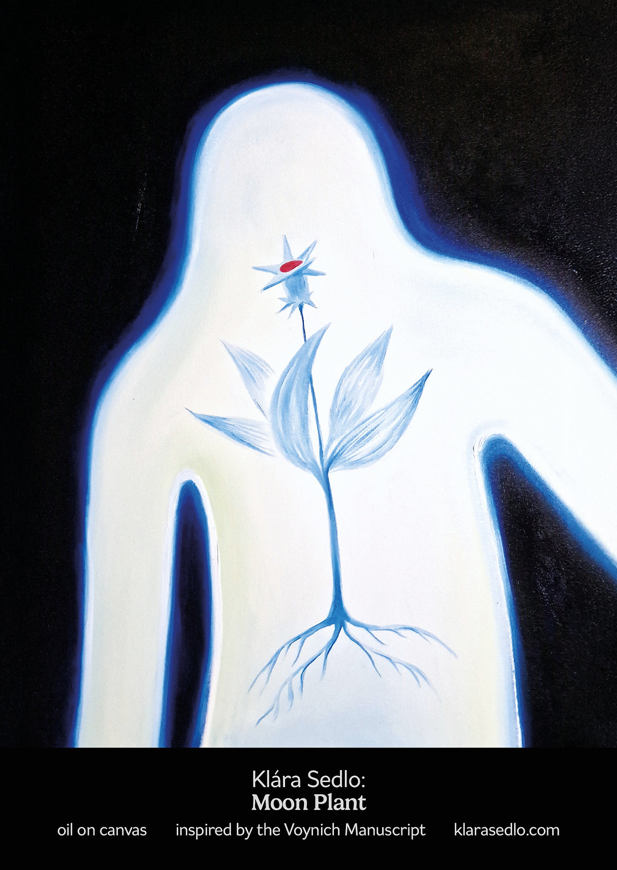 Postcard with a motif of a painting by Klára Sedlo, inspired by the famous Voynich manuscript - a mysterious medieval book full of unknown symbols and fantastic plants, the meaning of which remains unclear to this day.