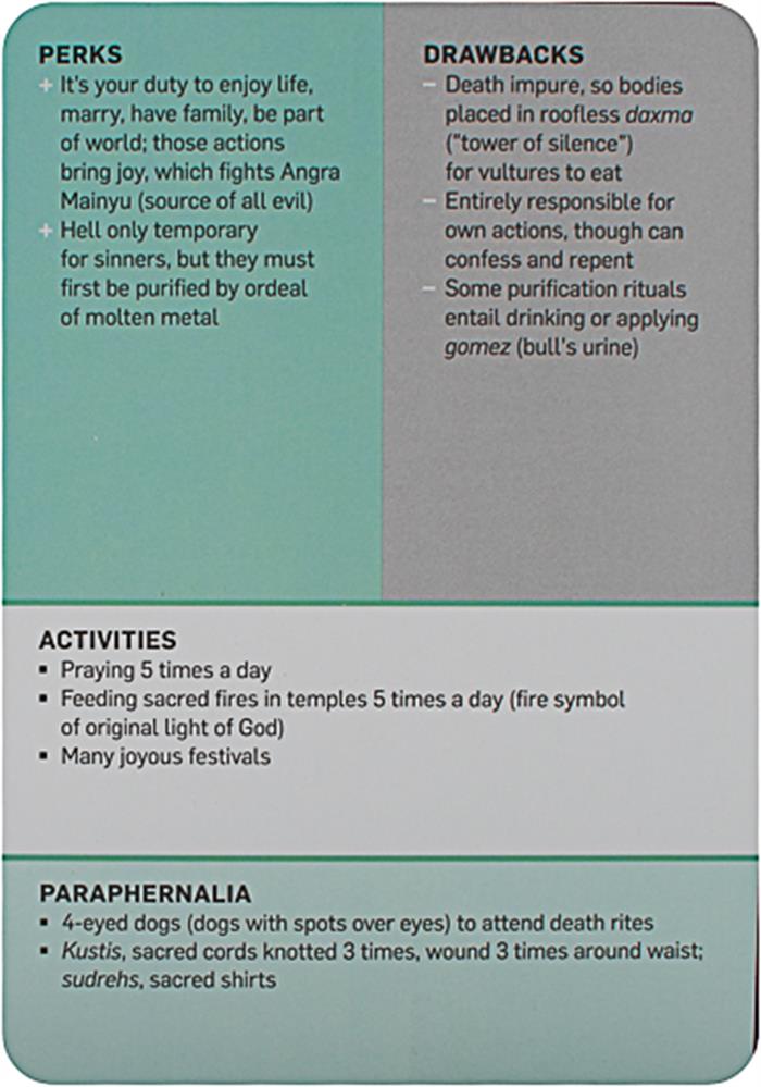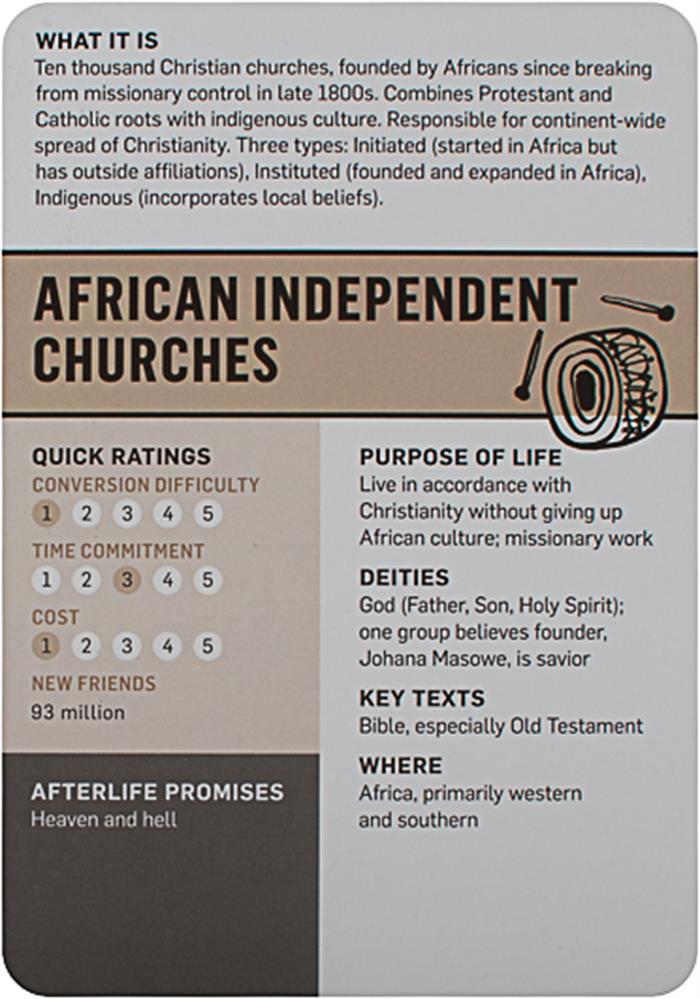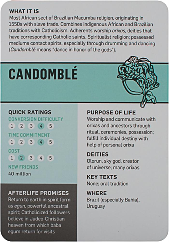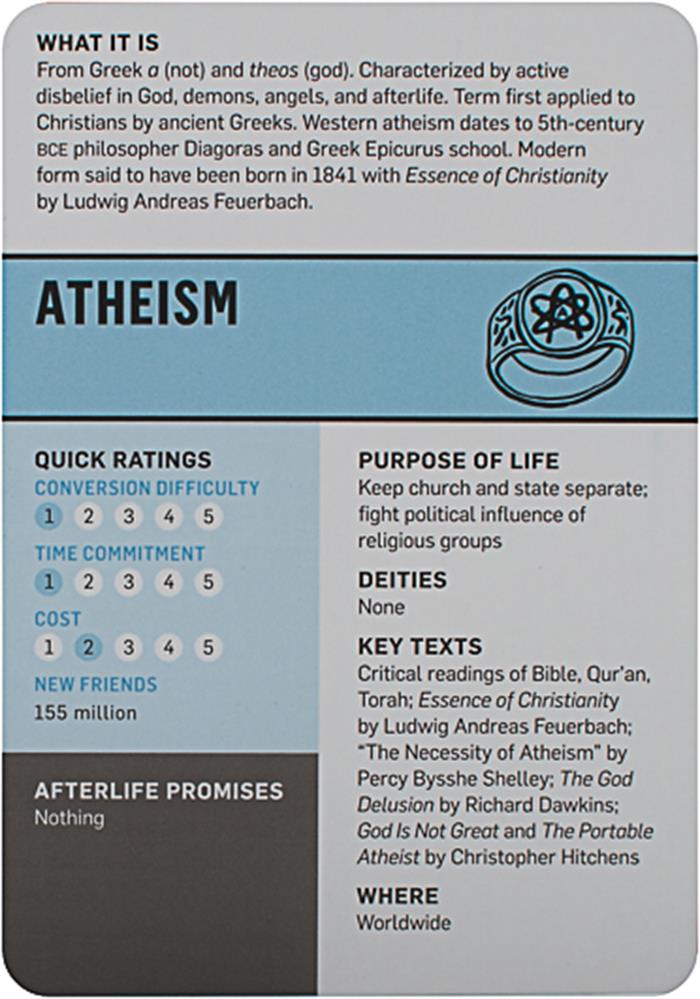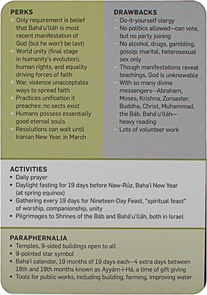 Choose a religion that conveniently fits your lifestyle! This compare-and-contrast deck features the lowdown on 50 religions-from Baha'i to Temple of the Vampire-so you can easily pick what's best for you and your everlasting soul.