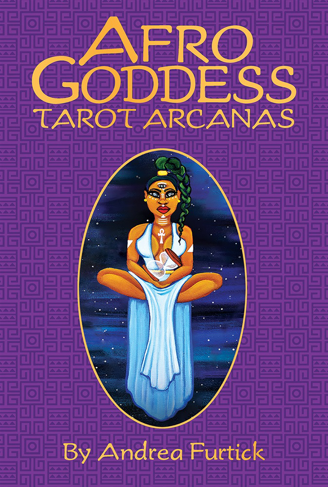 Spiritual storyteller and visionary artist Andrea Furtick created The Afro Goddess Tarot Arcanas to offer an enlightened viewpoint for diverse readers. She designed the 80 cards with vibrant colors, a blend of ancient and modern symbolism, and a wide array of melanated skin tones. The cards are printed on holographic paper with gold gilded edges. The exuberant deck realigns the traditional esoteric structures for a more positive, accessible, inclusive and transformative tarot experience.