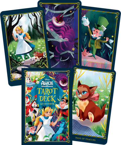Let Alice, the Mad Hatter, and the Queen of Hearts guide your tarot practice with this beautifully illustrated tarot deck inspired by Disney’s classic animated film Alice in Wonderland.