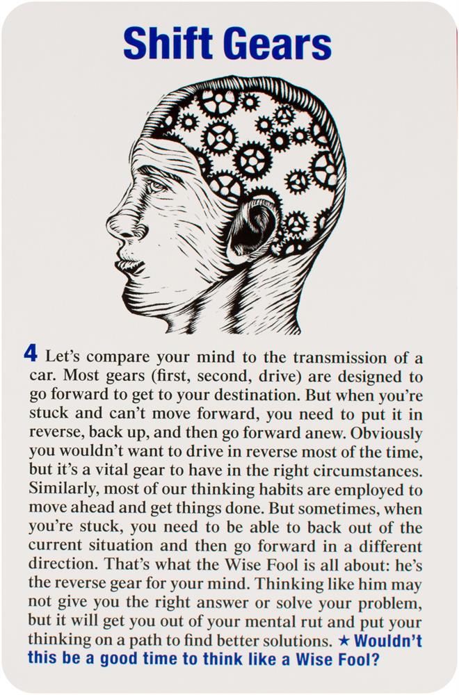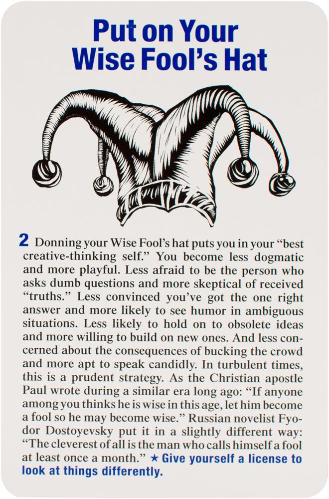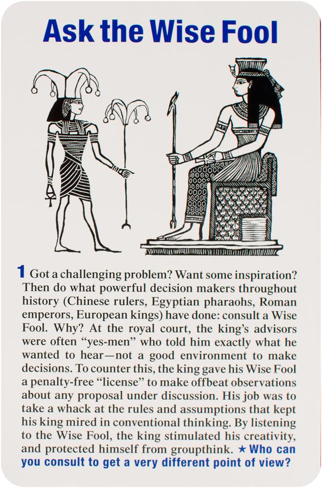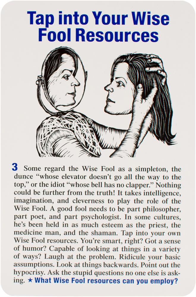 Ask the Wise Fool card deck offers 66 practical strategies for stimulating creativity and gaining new perspectives on solving challenges. Each card in the deck presents: a nugget of advice, an illustration, a story that highlights the principle, and a question to help you apply the idea to your situation. The three ‘suits’ relate to the qualities of the Fool: the Contrary, the Creative, and the Cautionary. The 96-page illustrated guidebook offers additional ways to incorporate Wise Fool thinking into your life.