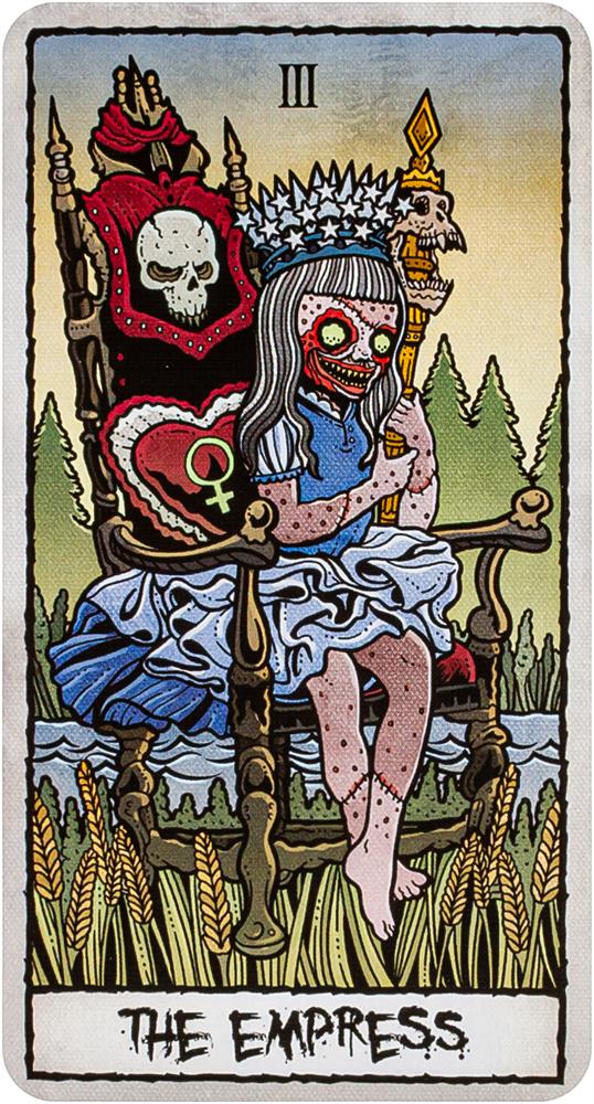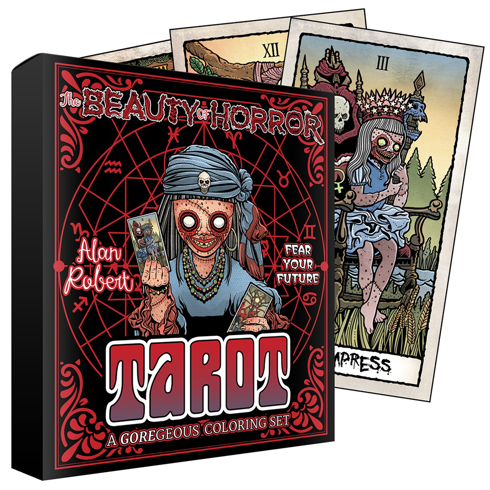 A traditional tarot set, Fear Your Future comes packed with 22 major and 56 minor arcana cards all illustrated by The Beauty of Horror mastermind Alan Robert, and fully-colored by iconic horror artist and colorist Jay Fotos. Cards feature linen finish and are standard tarot size 67 x 126mm.