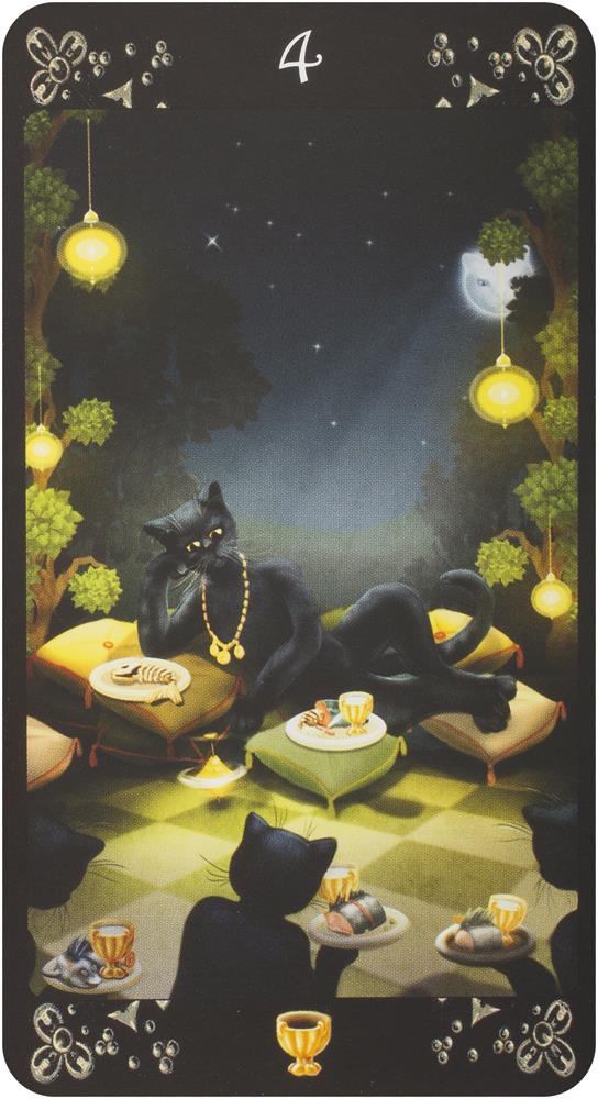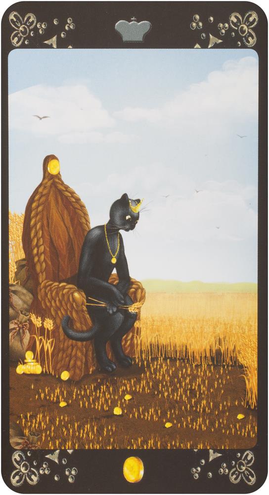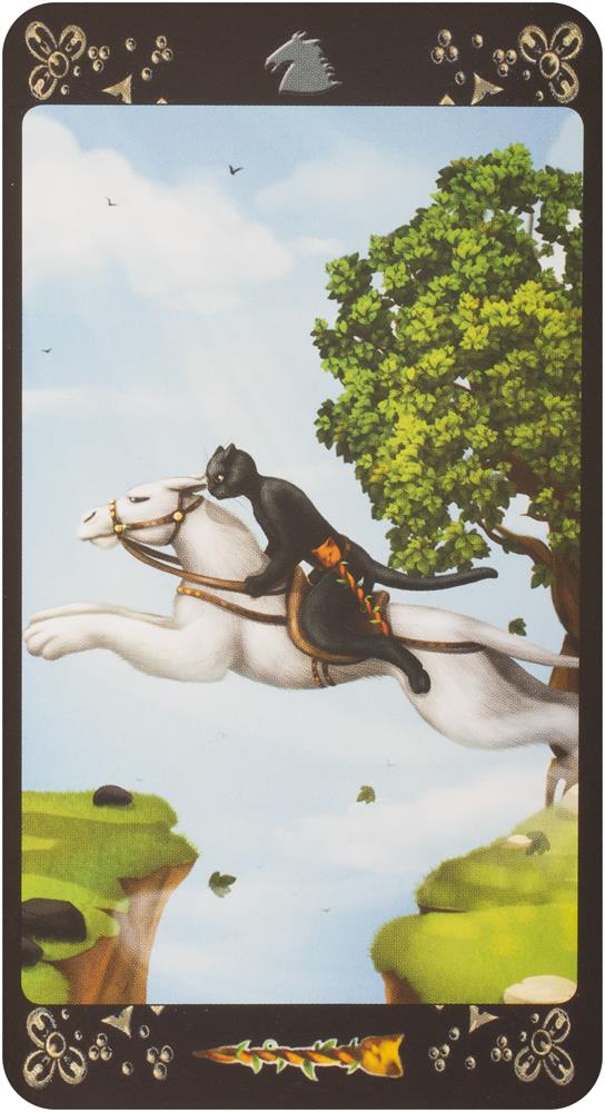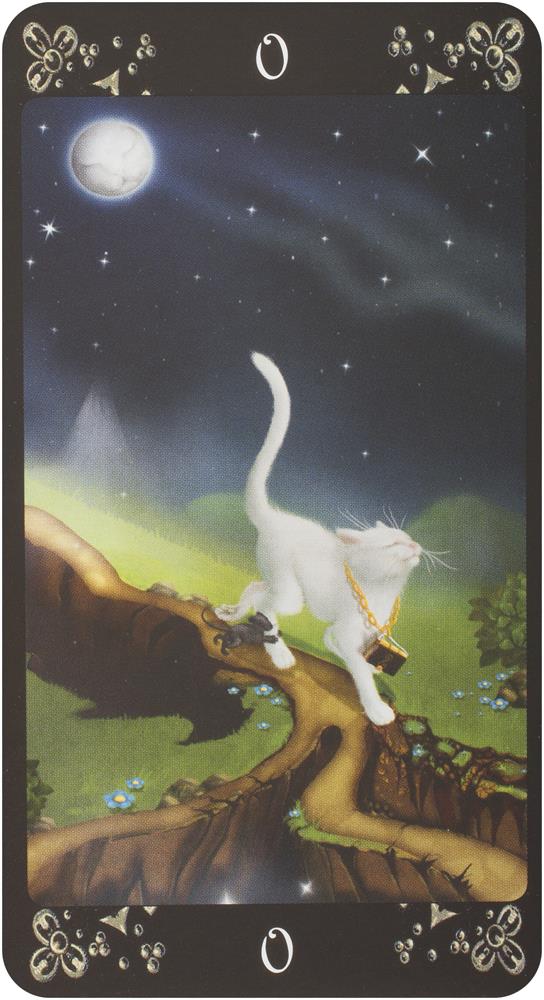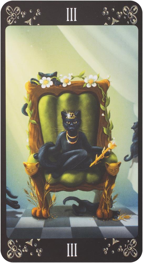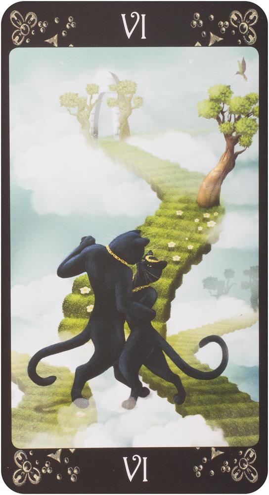 This Rider-Waite-based tarot celebrates and honors the beautiful and magical black cats. Cleverly incorporating feline characteristics and legend into traditional tarot archetypes, this fanciful deck captures these creatures moving between worlds of reality and fantasy, the mundane and mystical. Disarmingly cute yet unmistakably wise, the black cats encourage you to explore your own animal nature.