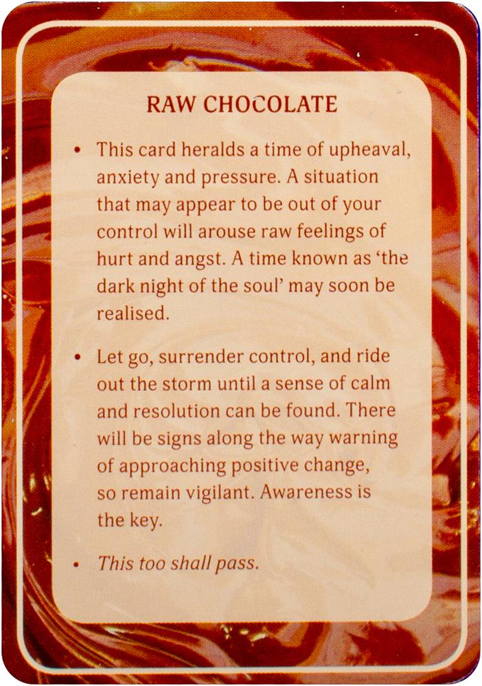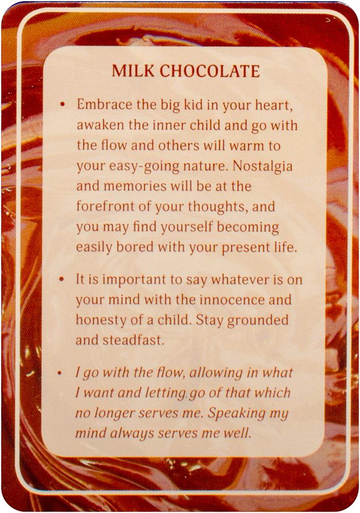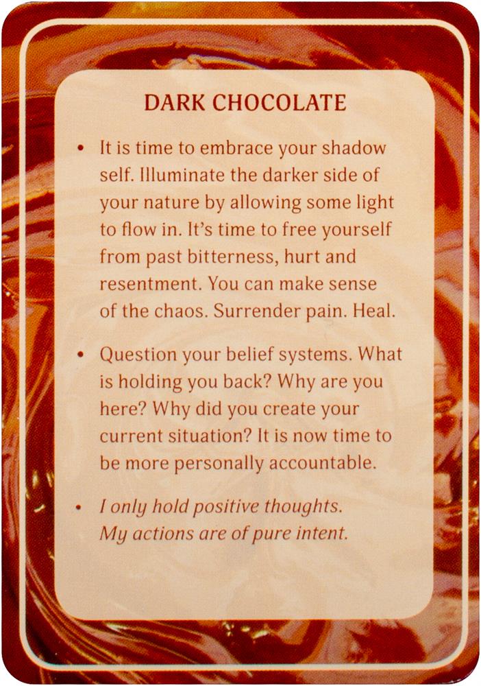 Everyone loves chocolate, right? Well, what if we told you that besides its addictive qualities, which are said to offer natural highs, chocolate can, also, be looked to for personal advice or spiritual affirmation? What if we told you that chocolate holds within it symbolic wisdom potent enough to guide you along life's path? What if we told you that, depending on what type of chocolate you prefer, it would be possible to determine things about your personality or what direction you may want to take in life? Well, Rosie Shalhoub—a life-long, dedicated, die-hard fan of Chocolate—has developed a system that proves that while you may have reason to love chocolate, chocolate, in its own way, loves you right back! What better high can you get than the one that comes from knowing you're on the right track in life—all because you've chosen to heed the advice of chocolate! Who would have thought?! Offering 70 different 'types' of chocolate, including a variety of chocolate sorts, variations on the chocolate theme, chocolate flavours and centres and chocolate-worthy occasions, the CHOCOLATE LOVER'S MESSAGE CARDS are a 70-card affirmation deck offering the reader clear instructions for use. Each card is deliciously illustrated with a photograph of each 'type' of chocolate and supported by a key word that invites the reader to explore the 'meaning' on a deeper, more personal level. By turning the card over, the reader is offered a three-phase message that explains the meaning of the chocolate, the 'action' the chocolate is suggesting we take to improve or enhance our life and an affirmation that helps still the mind and lull the reader into a state of spiritual and emotional confirmation, insight and healing.