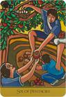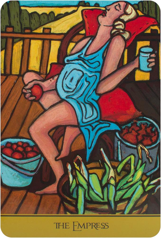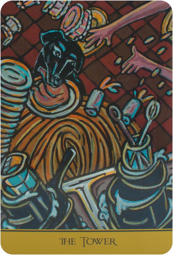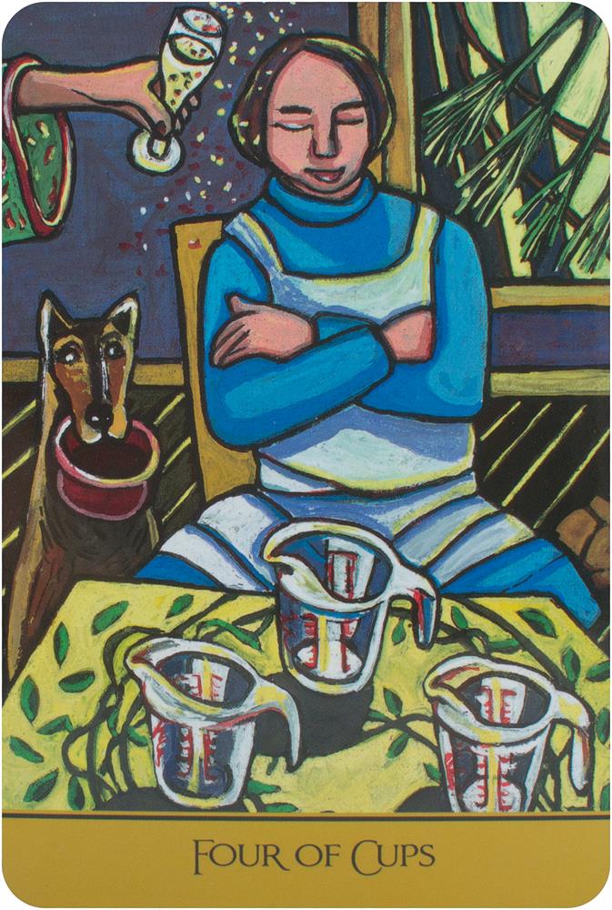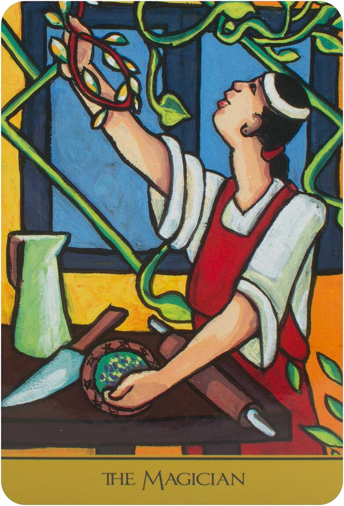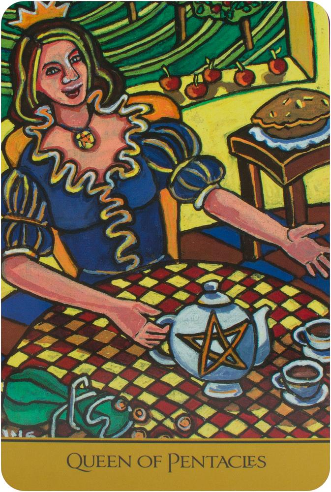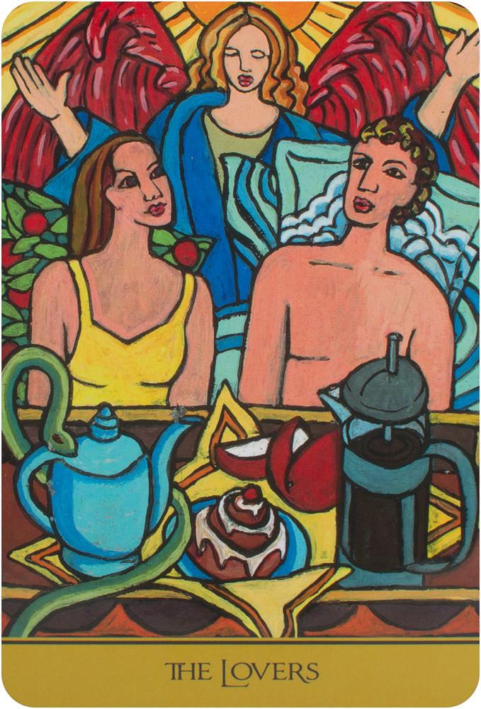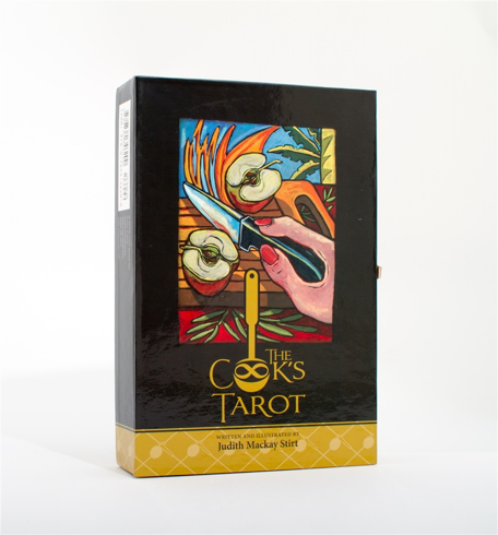 It is time to take the heart of the matter to the heat of the kitchen, taking in the Tarot like the scent of warm cookies, just from the oven. Depicted with the wisdom and delight of a home-spun conversation around a kitchen table, this deck presents 78 hand-painted images that revolve around a lively culinary theme. Bright colors and often whimsical humor provide an instant connection and reading experience for anyone who has ever put two slices of bread together. In a narrative style, the accompanying comprehensive guide provides a sophisticated understanding of Tarot Archetypes and philosophy. Card meanings are based on the traditional Rider-Waite-Smith standard, yet project their own original flavor. This deck and guide is a must-have for both the serious Tarot practitioner, as well as for those looking to find spirituality in their everyday lives. Bon Appetit