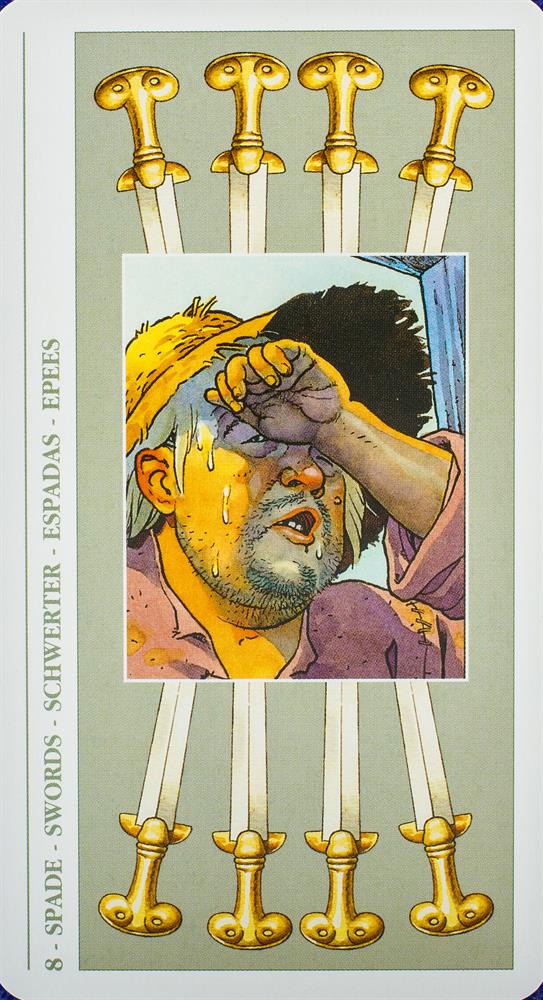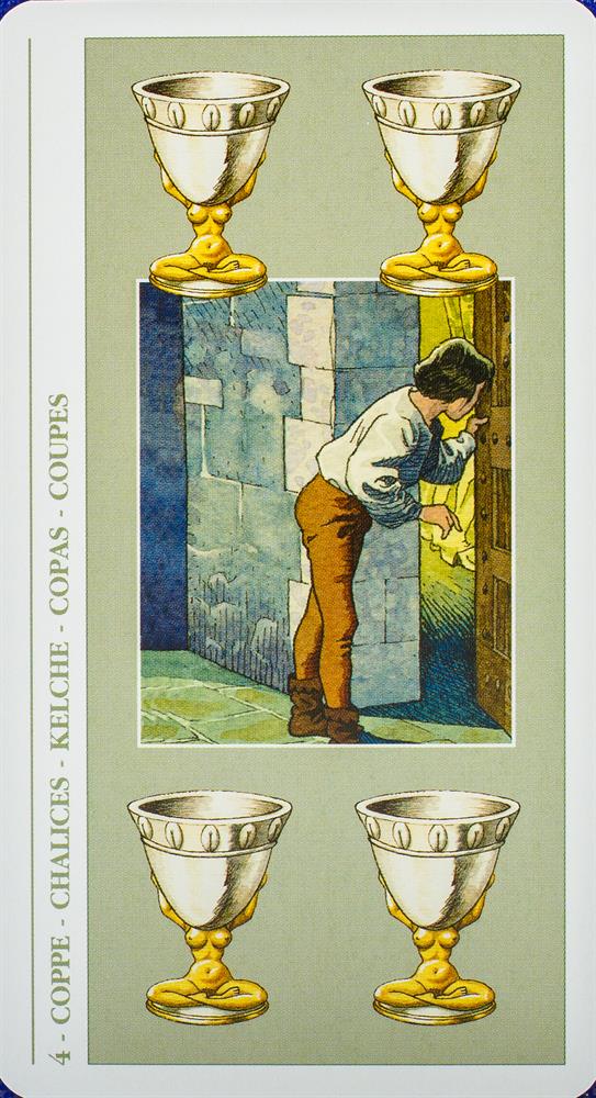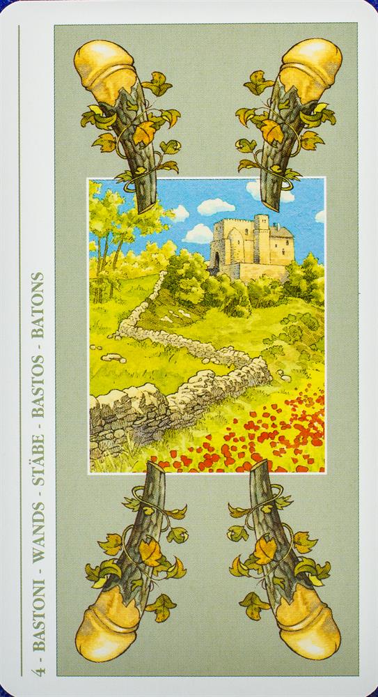 The scenes on each card are reminiscent of medieval stained glass associated with majestic cathedrals. Each card touches the subconscious in a profound way, and the spiritual and inspirational imagery brings the viewer to a higher level of consciousness. The wardrobes of the figures are resplendent in color and historic detail, and the scene on each card is luminous. The cards include symbols that