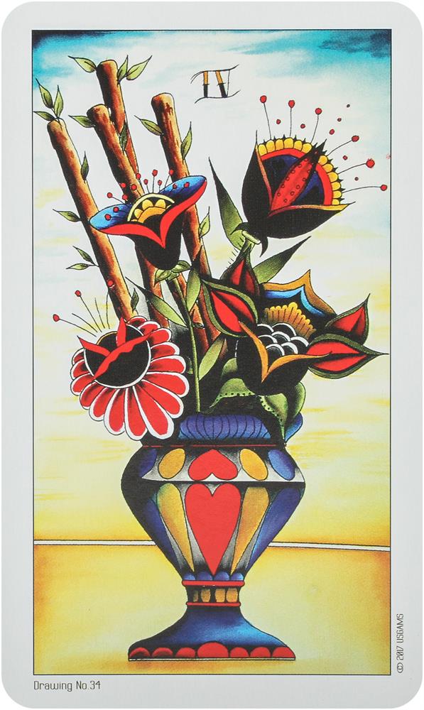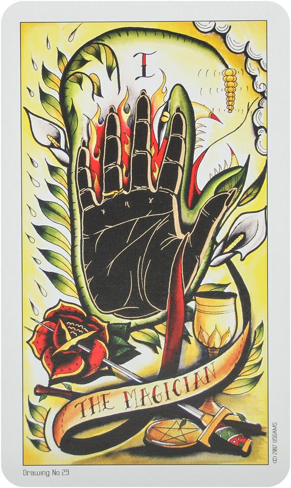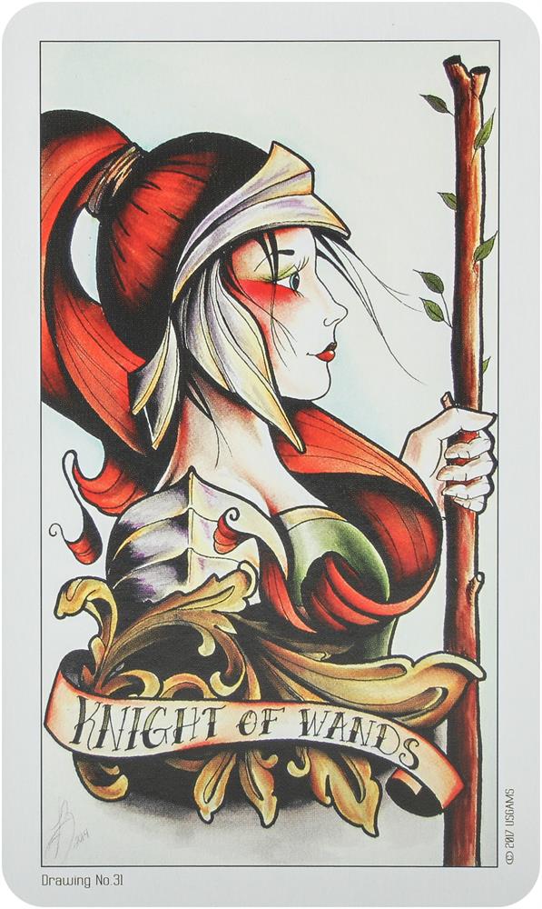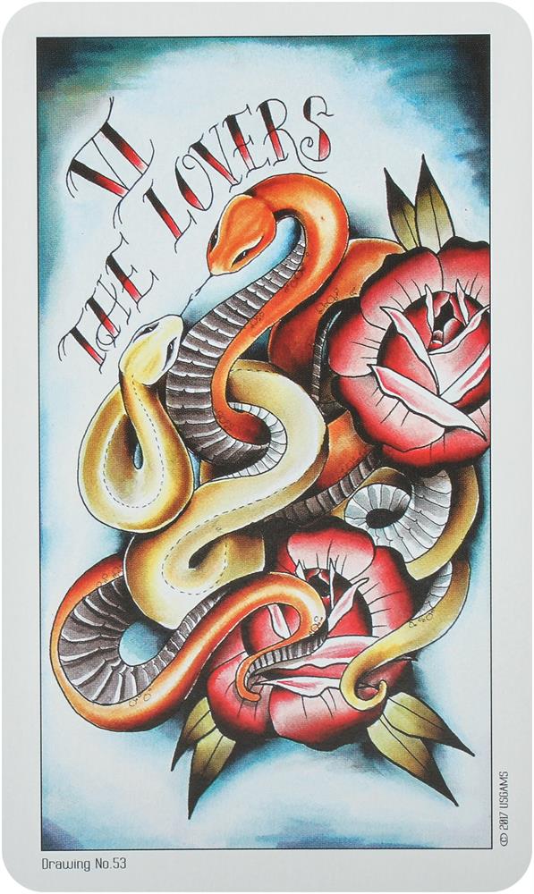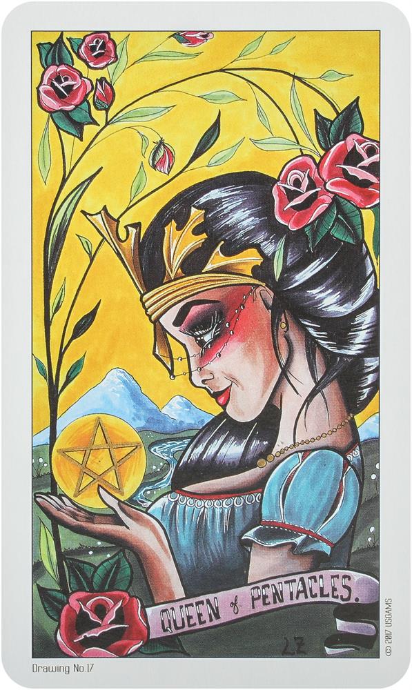 This vividly illustrated deck follows the artistic development of tattoo artist and designer Lana Zellner. The 82-card deck includes all of her original tarot art plus four new cards painted specially for this edition. The cards feature art forms and iconic imagery from both tattoo and tarot traditions, all hand drawn and painted using the watercolor painting style of “spitshading.”