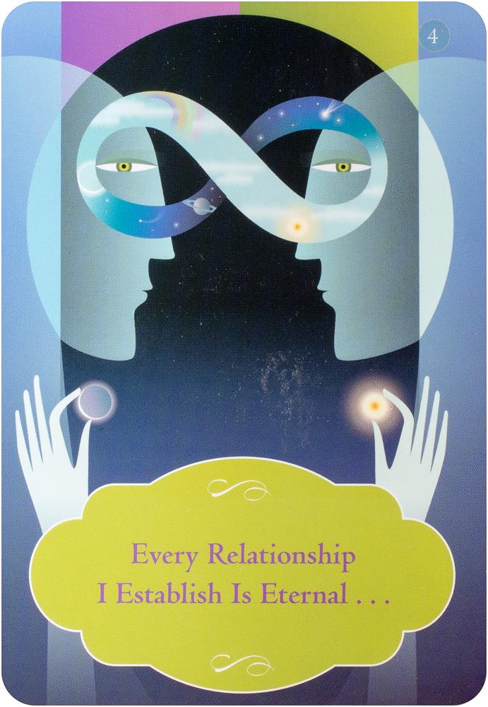 "Dear Friends, It is always satisfying for me to be able to tap into the Vibration of Abraham and to translate their empowering message into our current time and space. I really believe that this deck of cards not only contains everything necessary to attract and maintain wonderful relationships, but it also explains everything that we would ever need to understand about living our lives here in these bodies at this time. Every time I reflect upon the depth of understanding that is reflected in these cards, I am restored to my true nature. This deck of cards is my most precious possession. With love, Esther."