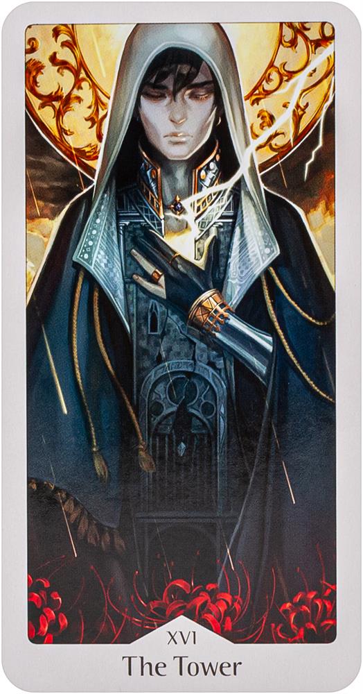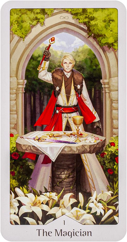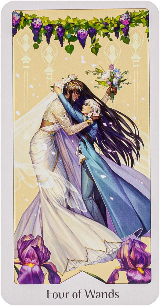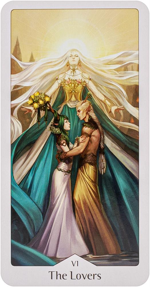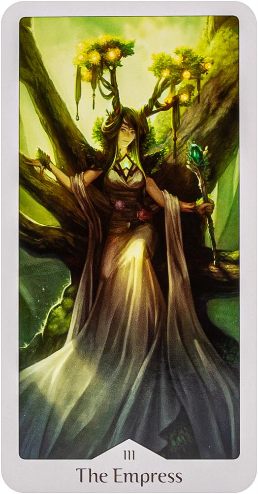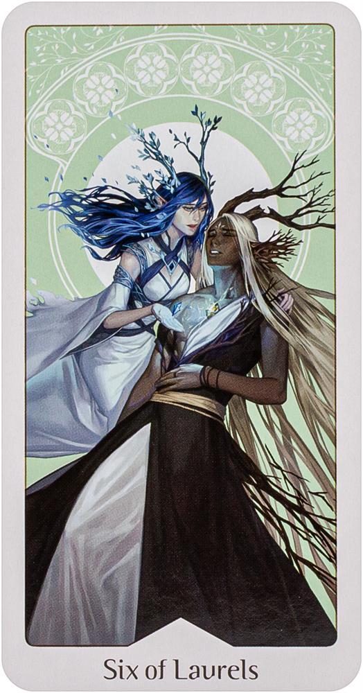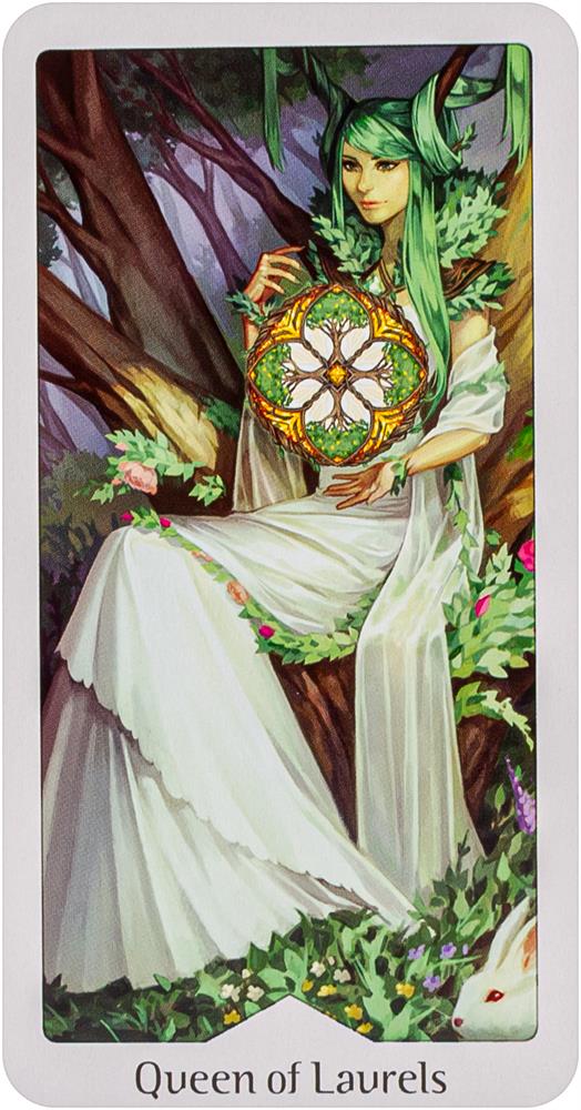 Heavenly Bloom Tarot blossoms with inspiration from both the natural and fantasy realms. Beautiful floral elements throughout convey peace and optimism. Five groups hold influence over a suit and an elemental sphere, offering us diverse perspectives of life on Earth: a winged intellectual tribe; strong, fiery desert warriors; amphibious elemental spirits; and a druidic tribe of earth spirits. Lastly, humans also share their hopeful insights as stewards of our precious planet.