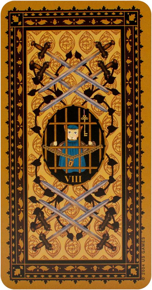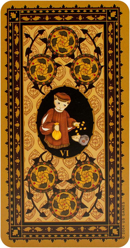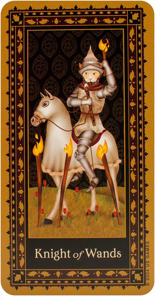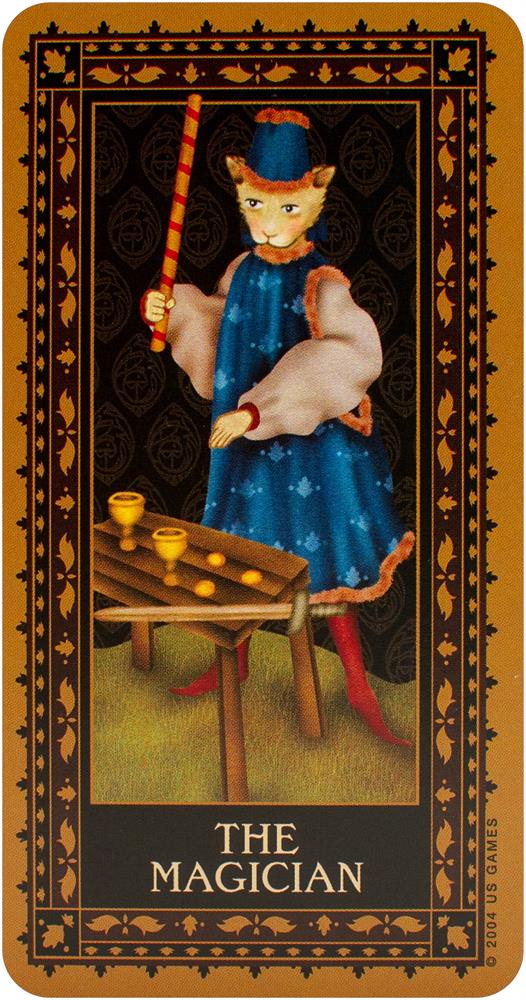 "Medieval Cat Tarot marries rich esoteric symbolism with truly wonderful artistic styling and expression. While there is a definite theme to the illustrations on the cards, this is not merely a collector's deck. Each card's meaning is rendered in a heartfelt but simple way so that anyone can appreciate and understand it. One need only seek to identify with the players in the drama acted out on each card. The characters on each card are shown either in the act of, or participating in, behavior and situations which describe the truest meanings of the card as it is understood in a more universal way, based upon the Golden dawn symbolism as interpreted by A.E. Waite."
