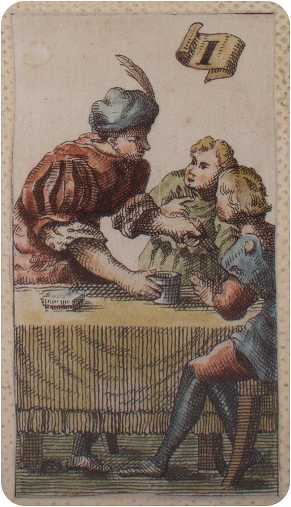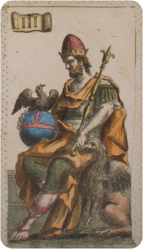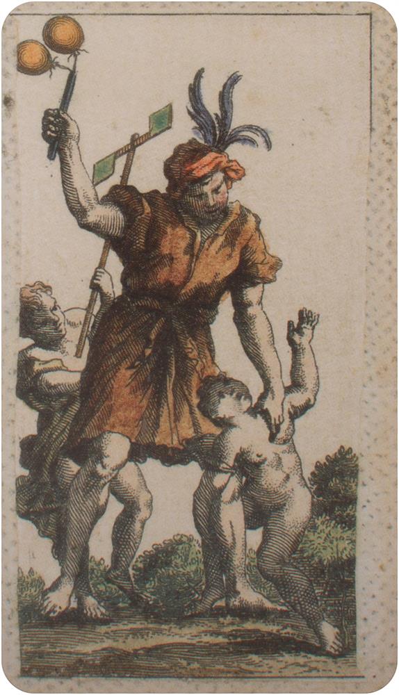 From the German Tarot tradition, a 78 cards deck illustrated with mythology themed scenes. The deck was printed using the technique of metal engraving and then colored with mask painting: a masterpiece of the XIX century.