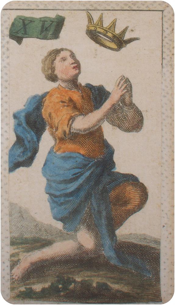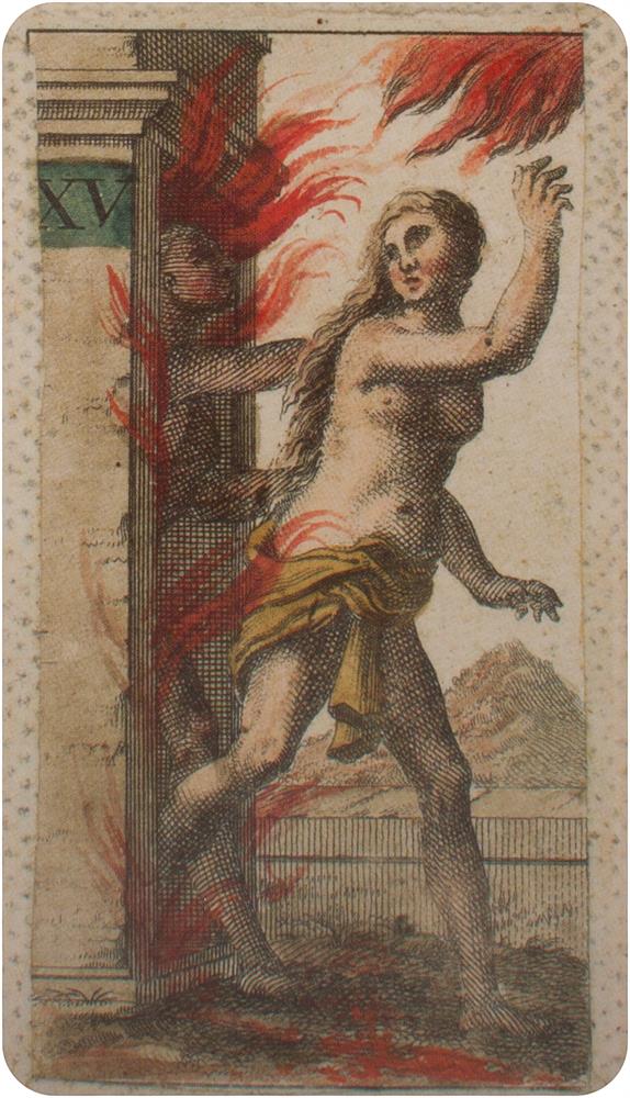 Created in 1725 by Dean Montieri, this is one of the rarest Tarot decks in the world, as most of them were burnt due to the influence of the Church. The deck follows the reduced number of cards as in the Bologna variant and does not feature illustrations on the cards, but rather indexes and notes by Montieri about XVIII century society, politics and geography. 62 cards and instructions.