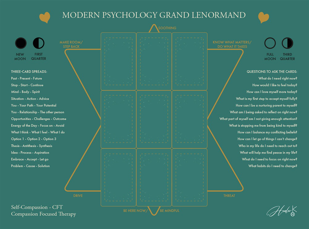 Table cloth 78 cm x 58 cm - Textile - Modern Psychology Grand Lenormand - English version. The print on the table cloth includes 9 card positions, 14 three-card spreads, 13 questions to the cards, the Emotional Regulation System triangle keywords (Soothing/Drive/Threat), ACT, Acceptance and Commitment Therapy, triflex keywords (make room/step back, be here now/be mindful, know what matters/do what it takes).