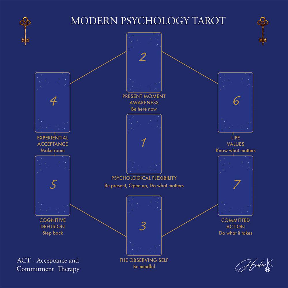Tarot table cloth 58 cm x 58 cm - textile - Modern Psychology Tarot - English text. The print on the table cloth includes 7 card positions, ACT, Acceptance and Commitment Therapy, hexaflex keywords (experiential acceptance/make room, cognitive defusion/step back, present moment awareness/be here now, the observing self/be mindful, life values/know what matters, committed action/do what it takes, psychological flexibility/be present-open up-do what matters).