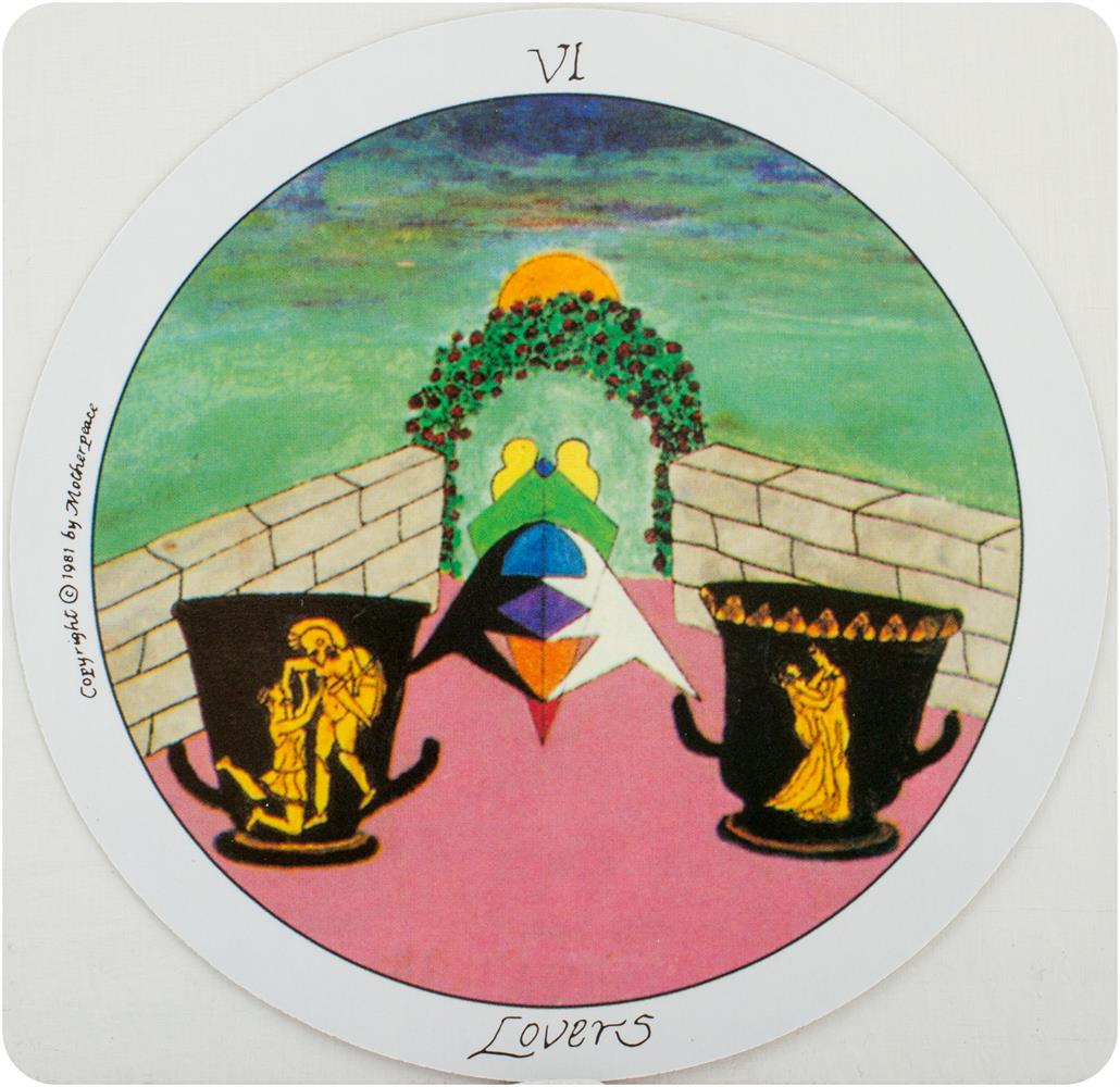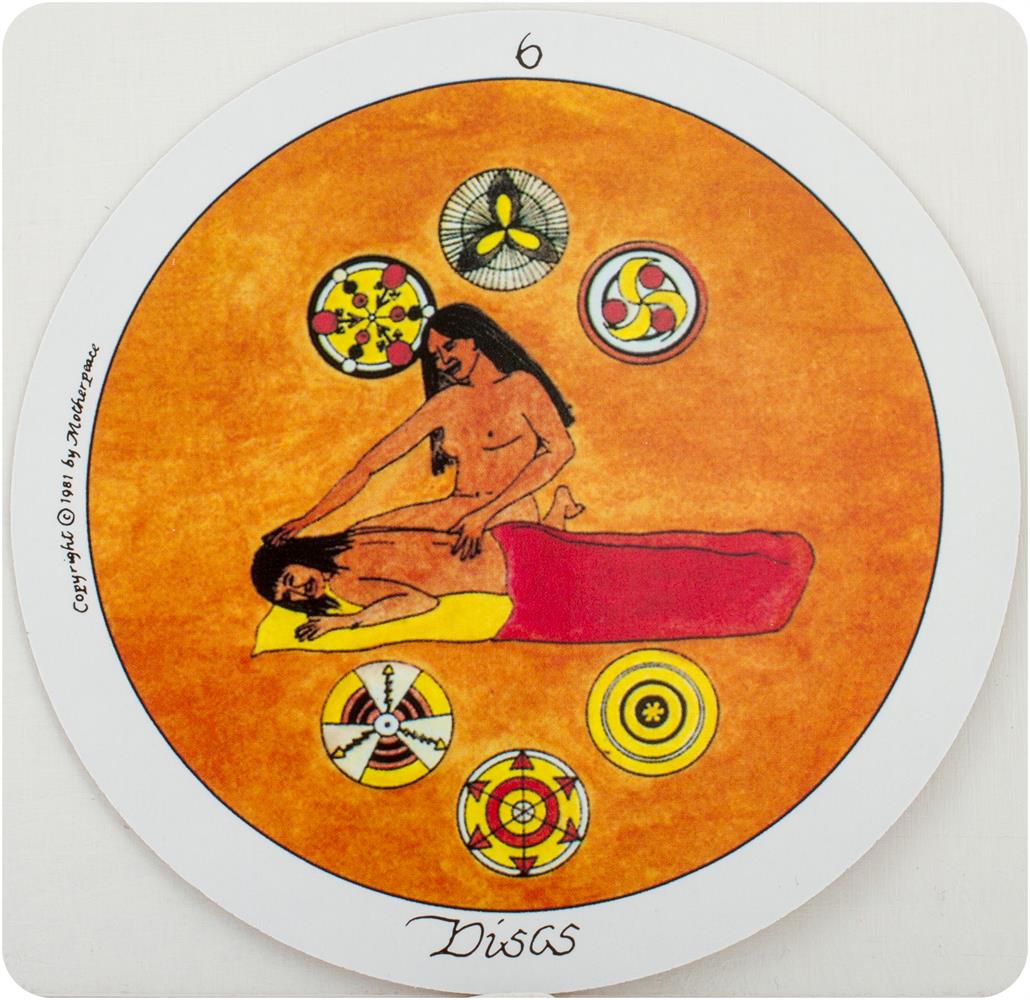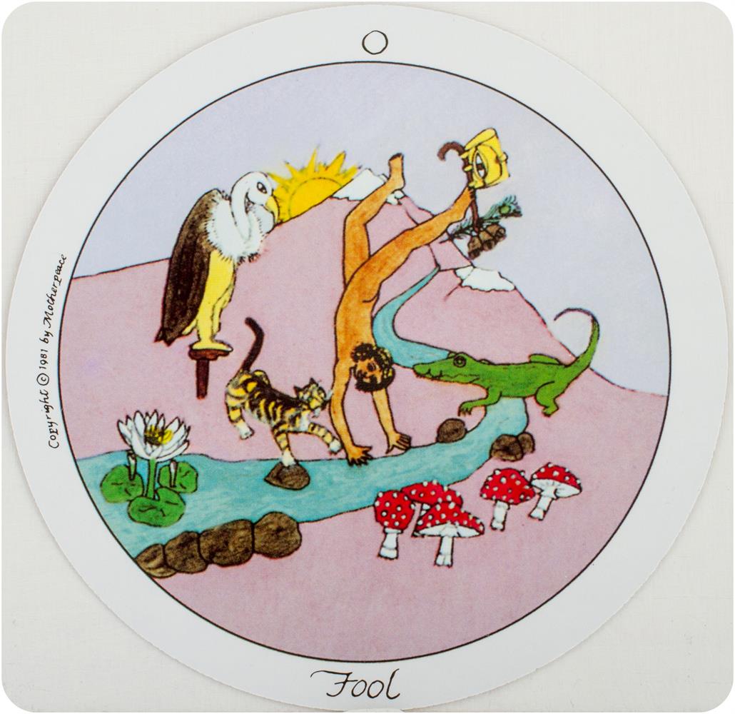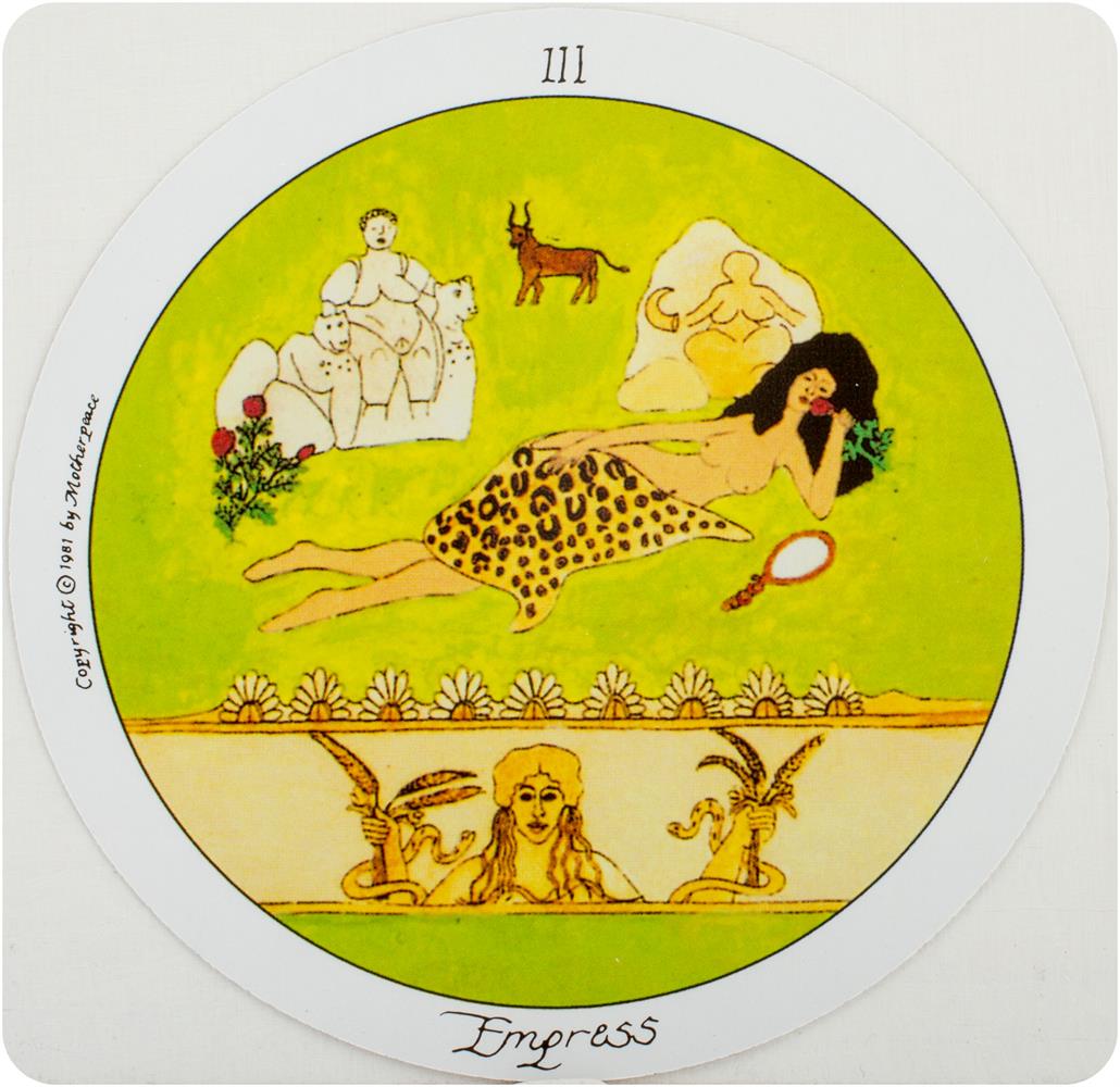 The cards in this extraordinary round tarot deck are gestalt circles of powerful symbols celebrating 30,000 years of women's culture throughout the world. 4 1/2" diameter.