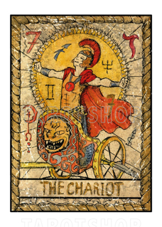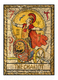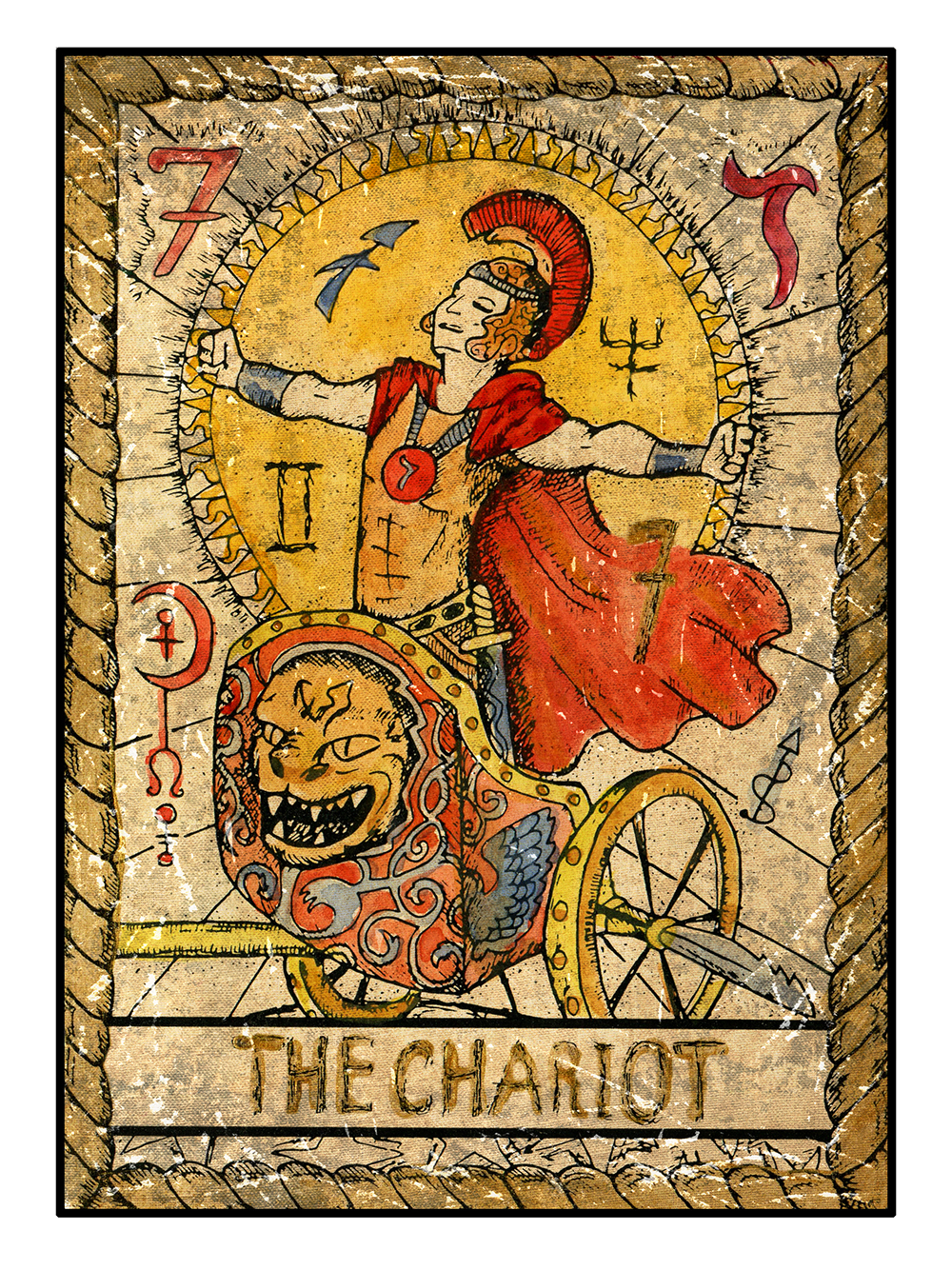 Illustration inspirerad av traditionell tarotsymbolik. Denna poster visar The Chariot (Vagnen).