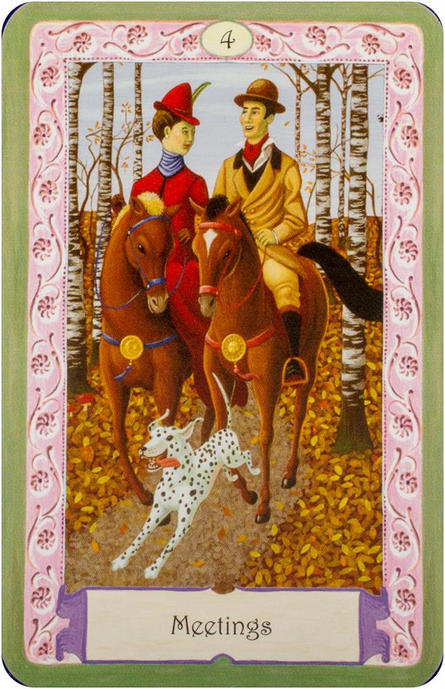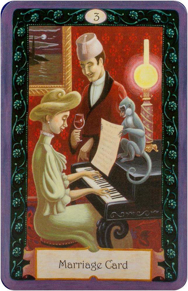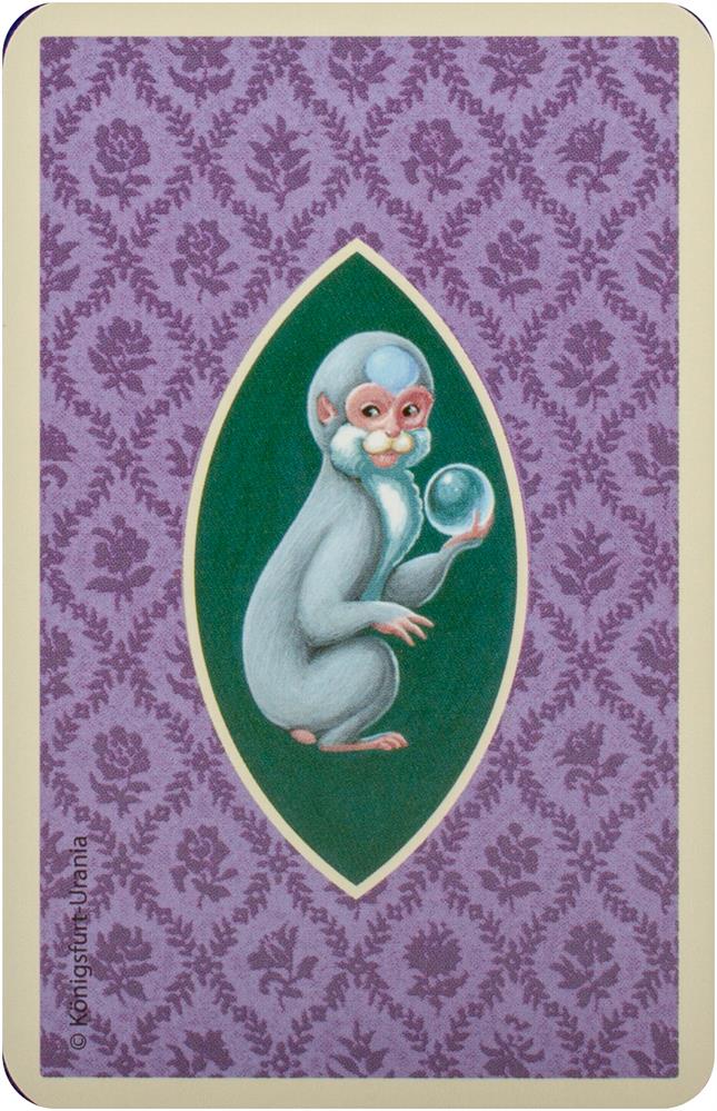 Vintage deck of 52 cards with miniature cards in the upper left corners and descriptive pictures with meanings on the remaining portions of the cards. Also suitable as a regular deck of playing cards. Includes instructions.