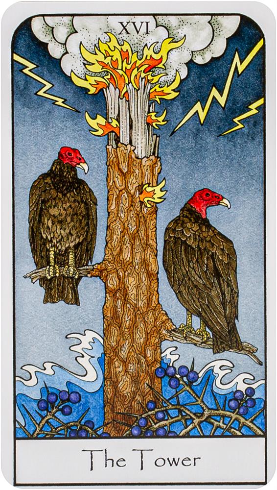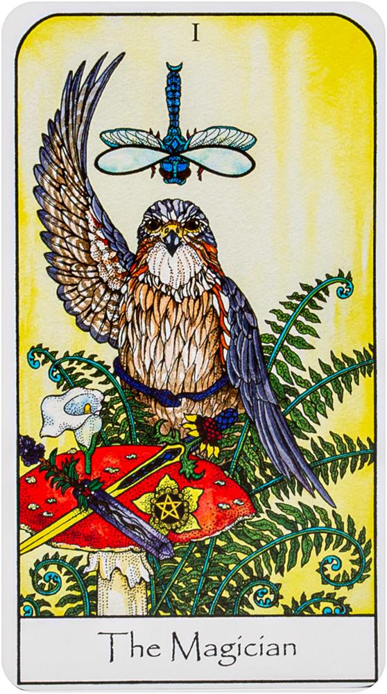 In the accompanying guidebook, each card is given a two-page description that opens with the traditional Tarot meaning of the card, followed by a detailed explanation of the symbolic meaning of the specific plants and animals the card features. For example, on the cover, the Magician card shows a Merlin Falcon, Amanita Muscaria mushroom, Western Sword Fern, and the Eastern Pondhawk Dragonfly--each of these life forms was chosen because it represents one or more aspects of the Magician’s meaning in the Tarot. The book explains the connections between each form shown and the card’s Tarot archetype, further illuminating the meaning of the card and how it relates to the natural world, personal development, and the journey of the soul.