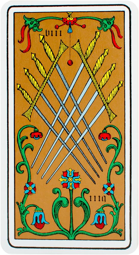 The 56 Minor Arcana cards present the four traditional suits of Swords, Batons, Cups and Coin. The pack includes a booklet of commentary by Stuart R. Kaplan on the Oswald Wirth Tarot Deck.