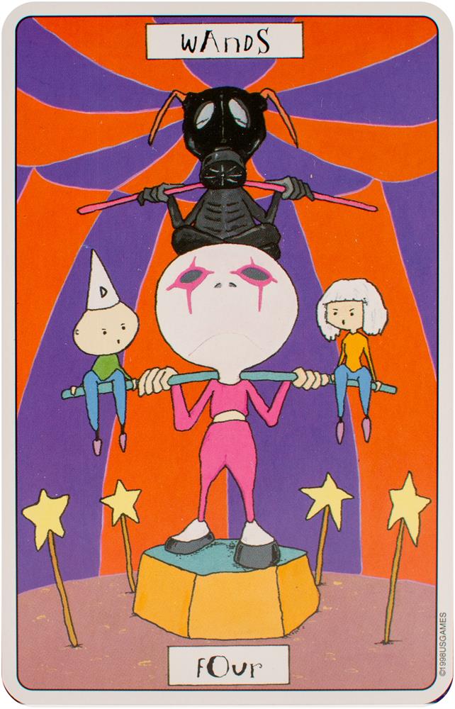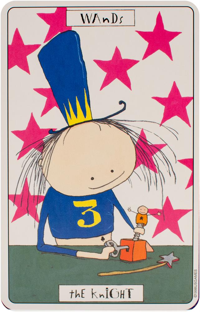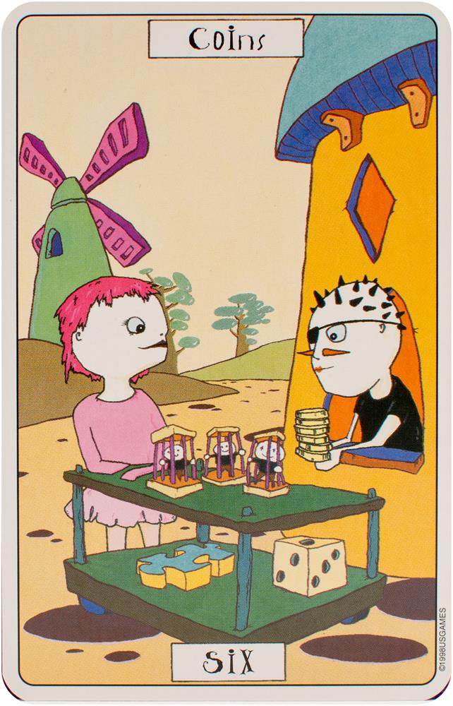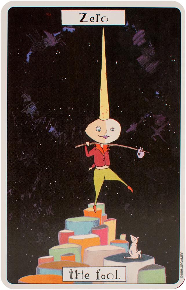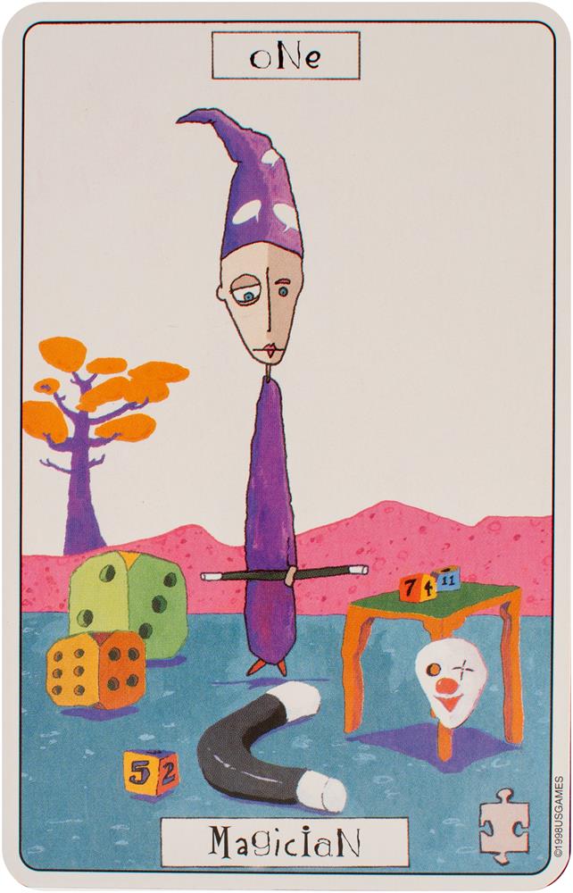 The card backs feature four motifs presented throughout the Major and Minor Arcana: the number 56, jigsaw puzzle pieces, dice, and a question mark. Each of the suits corresponds to an element and a setting. Swords relates to air and labyrinths. Wands correspond to fire and the circus. Cups relate to water and the desert. Coins are linked to earth and a small village. Each character in Phantasmagoric Theater Tarot is introduced with a lively description.