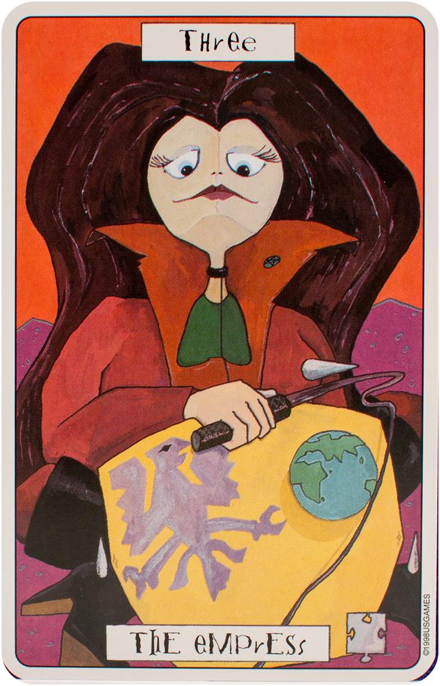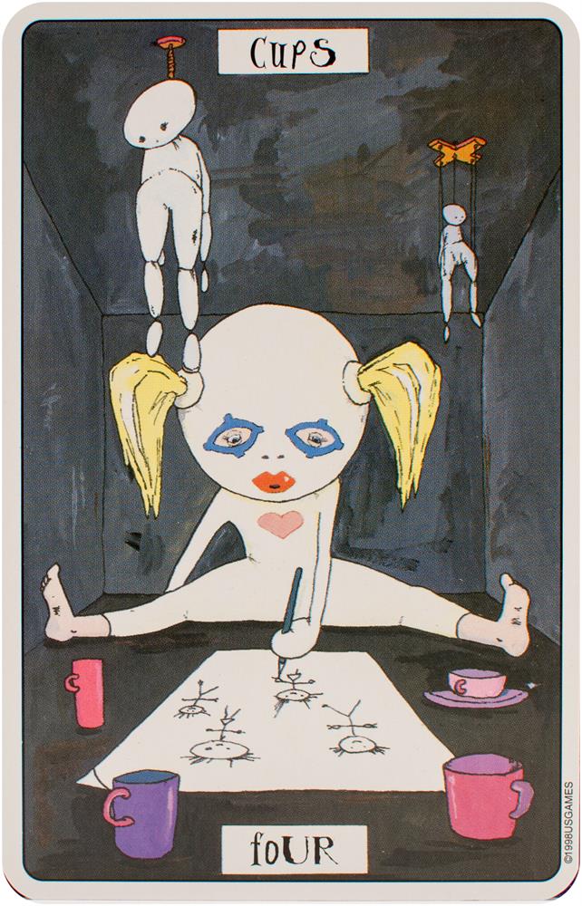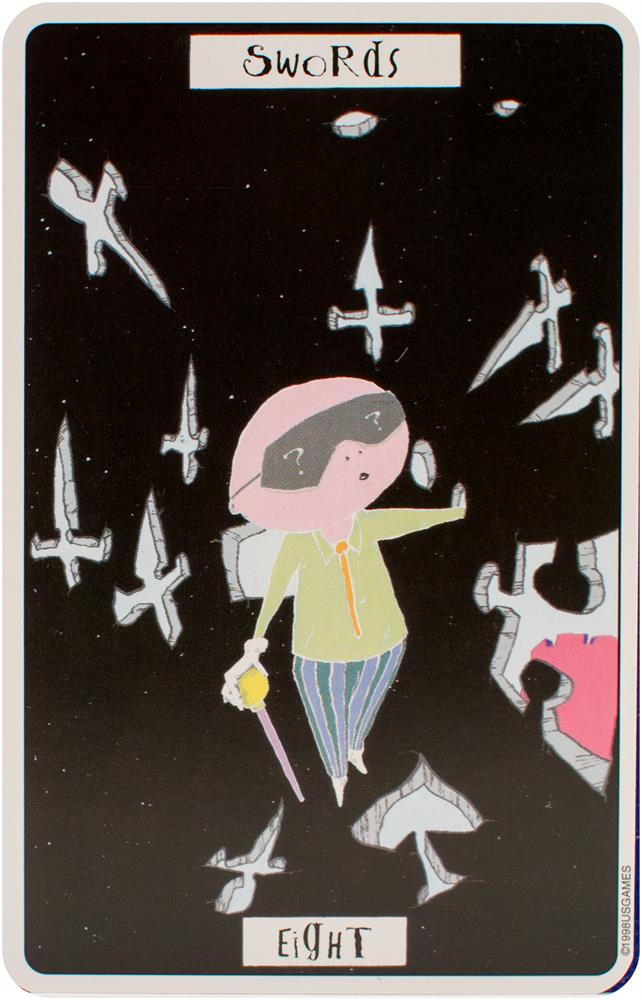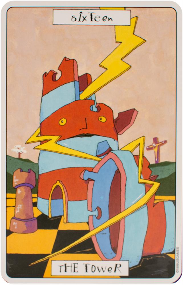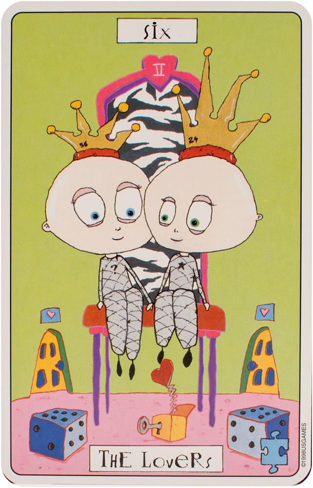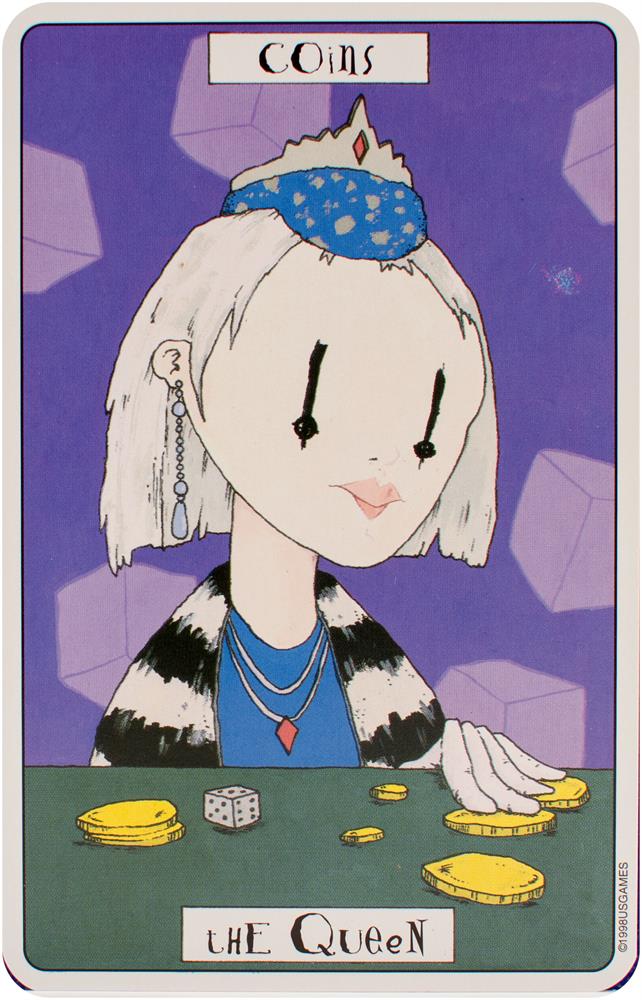 The card backs feature four motifs presented throughout the Major and Minor Arcana: the number 56, jigsaw puzzle pieces, dice, and a question mark. Each of the suits corresponds to an element and a setting. Swords relates to air and labyrinths. Wands correspond to fire and the circus. Cups relate to water and the desert. Coins are linked to earth and a small village. Each character in Phantasmagoric Theater Tarot is introduced with a lively description.