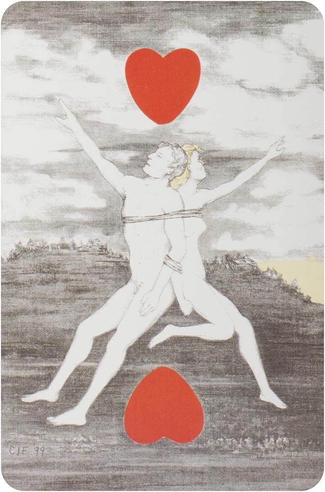 Vintage deck of 52 cards with miniature cards in the upper left corners and descriptive pictures with meanings on the remaining portions of the cards. Also suitable as a regular deck of playing cards. Includes instructions.