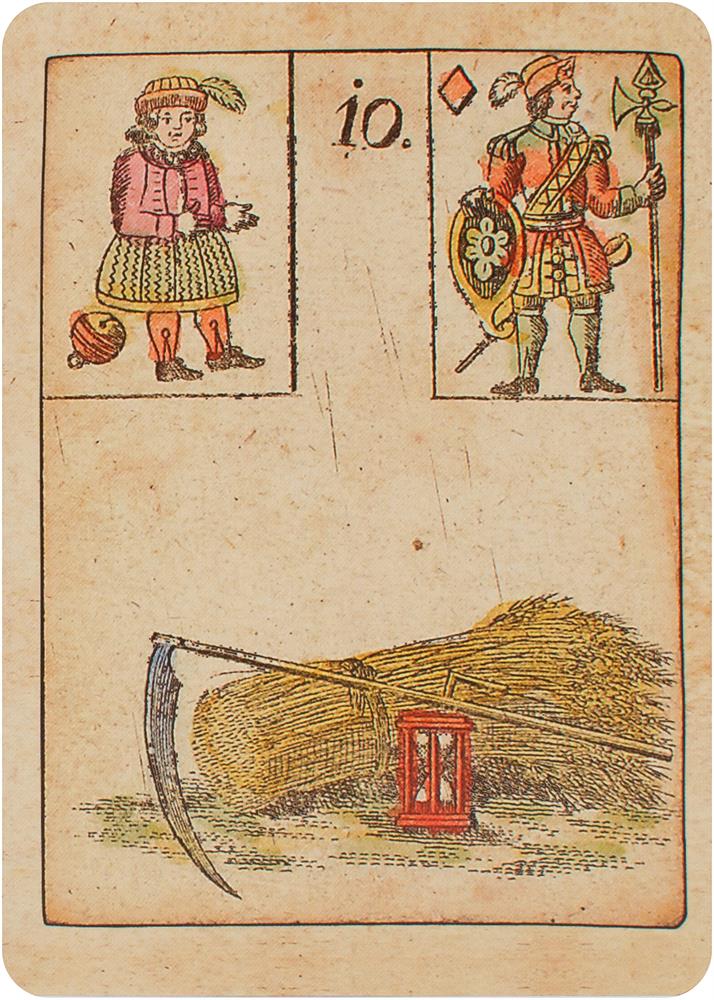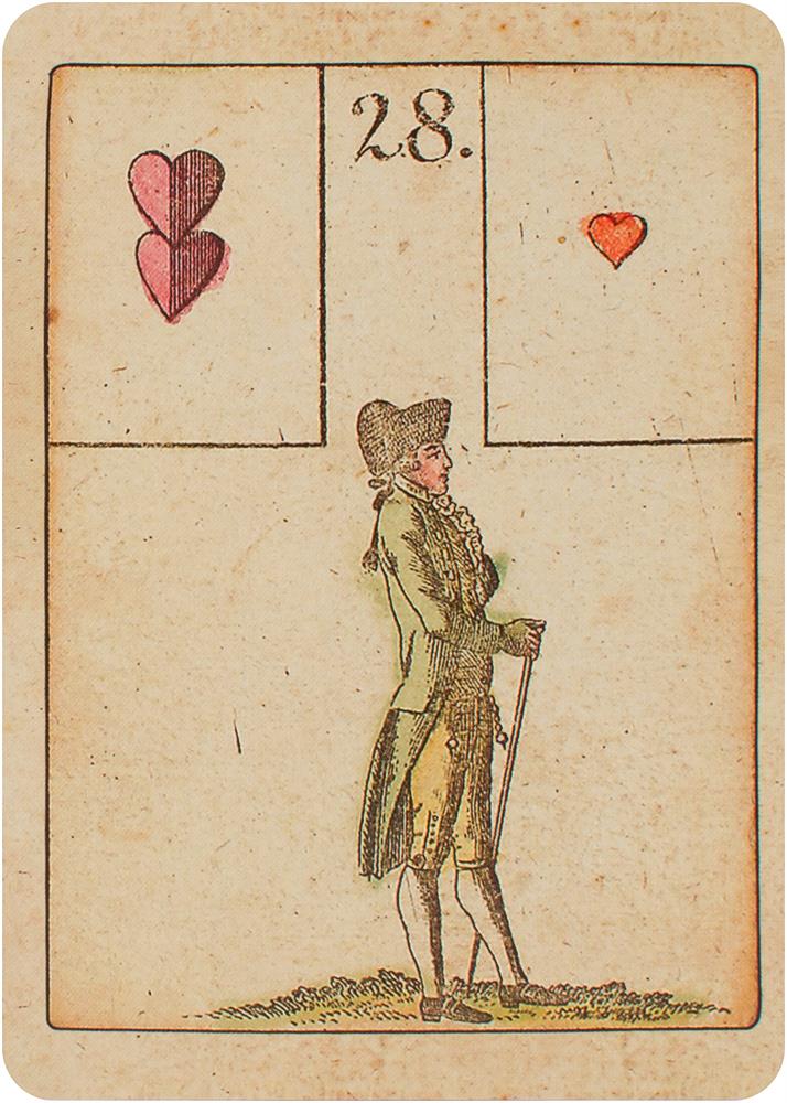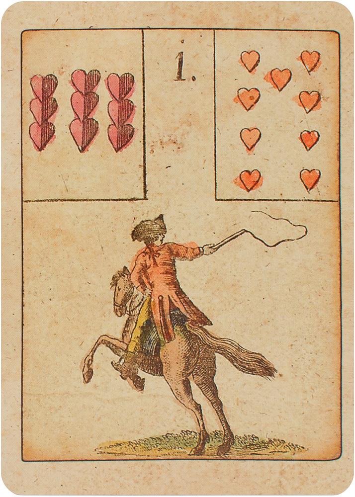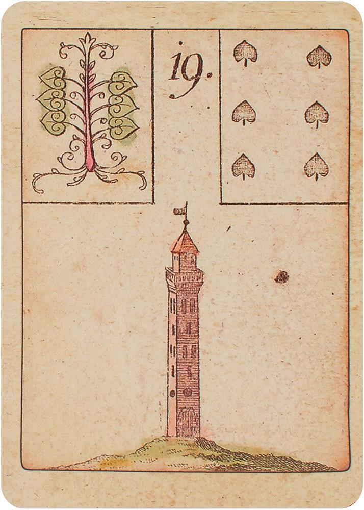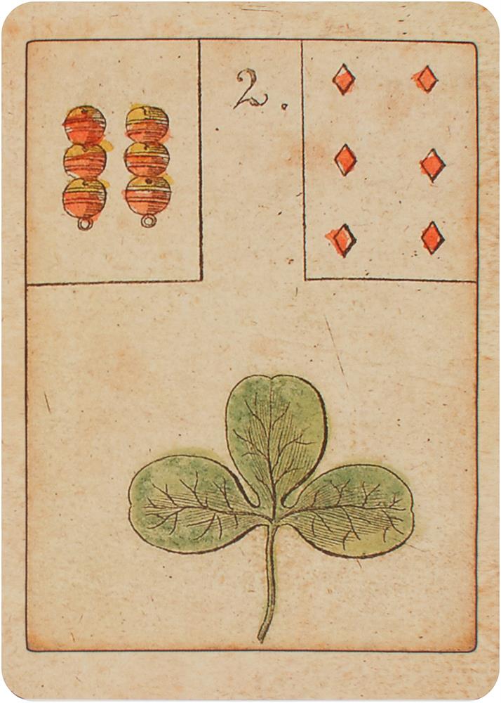 Das Spiel der Hoffnung - The Game of Hope - Le jeu de l'espoirDieses Spiel wurde von Johann Kaspar Hechtel erdacht und 1799 in Nürnberg veröffentlicht. Es war ein Gesellschaftsspiel und unter dem Namen Spiel der Hoffnung bekannt, da gewonnen hatte, wer als Erster die Nummer 35, Anker / Hoffnung erreichte. In diesem Spiel sind bereits alle 36 Motive (der Reiter, das Schiff, das Haus, der Ring usw.) der späteren Lenormandkarten vorhanden. Die ersten Lenormand-Orakelkarten erscheinen um 1846 in Koblenz. Aber auch das Original von 1799 enthielt schon eine Anleitung, die das Orakeln mit den Karten erklärt.