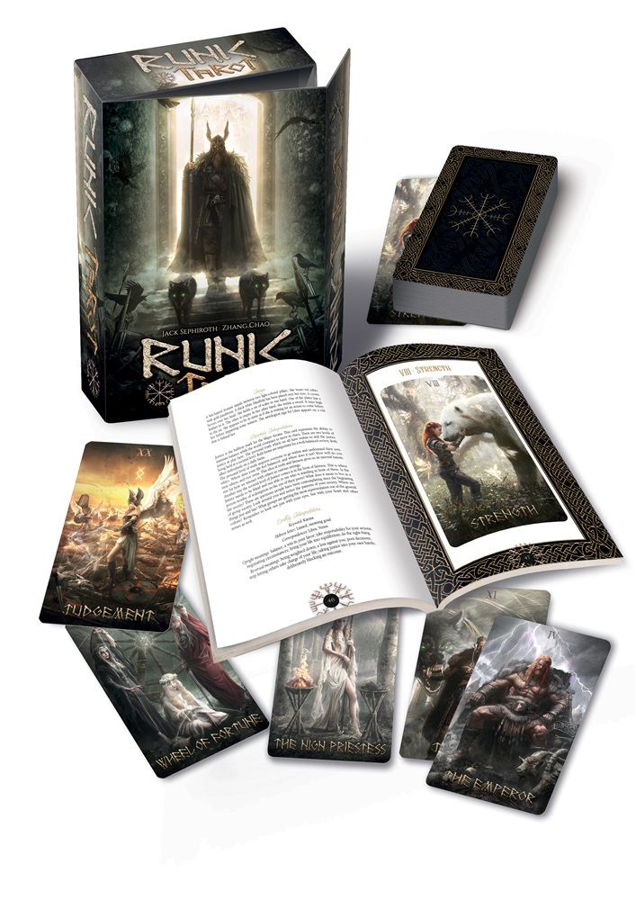 Valhalla: the Realm of the Gods. From the author of the Heaven & Earth, the Runic Tarot is the ultimate deck created over Norse mythology. This deck is a powerful, fierce holder of an ancient aura. It weaves together the wisdom of the Runes, the poetry of the Skalds, the valour of the Einherjars, and the evergreen bounty of life and nature. Runic Tarot is a tribute to the divine spark within humanity. With the companion book written by American writer Jaymi Elford.