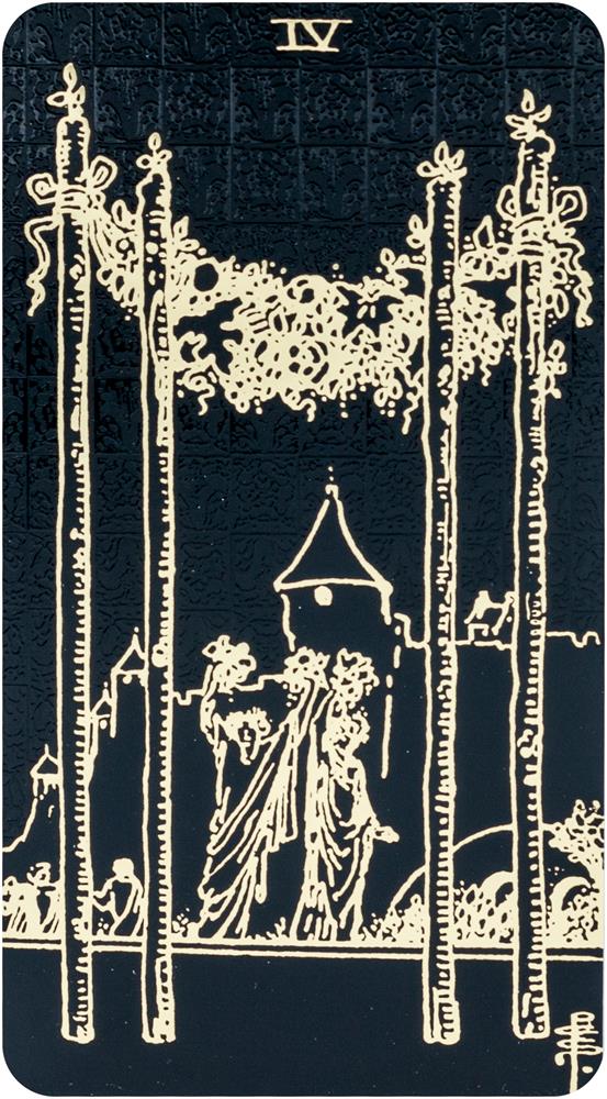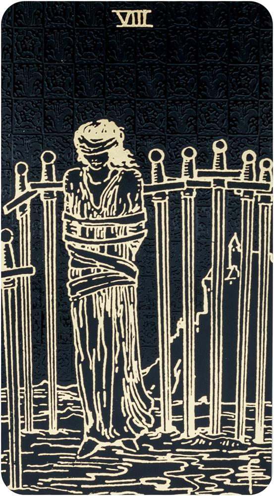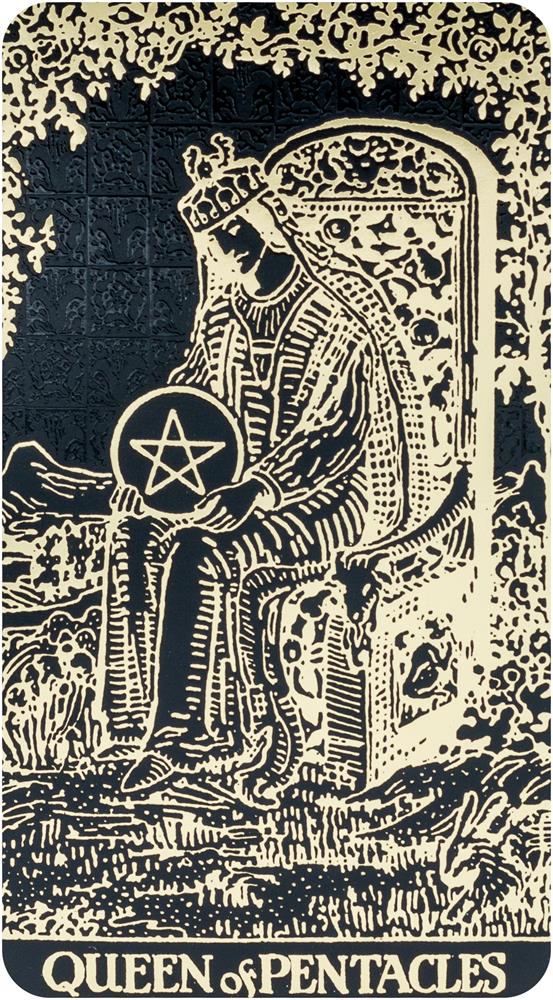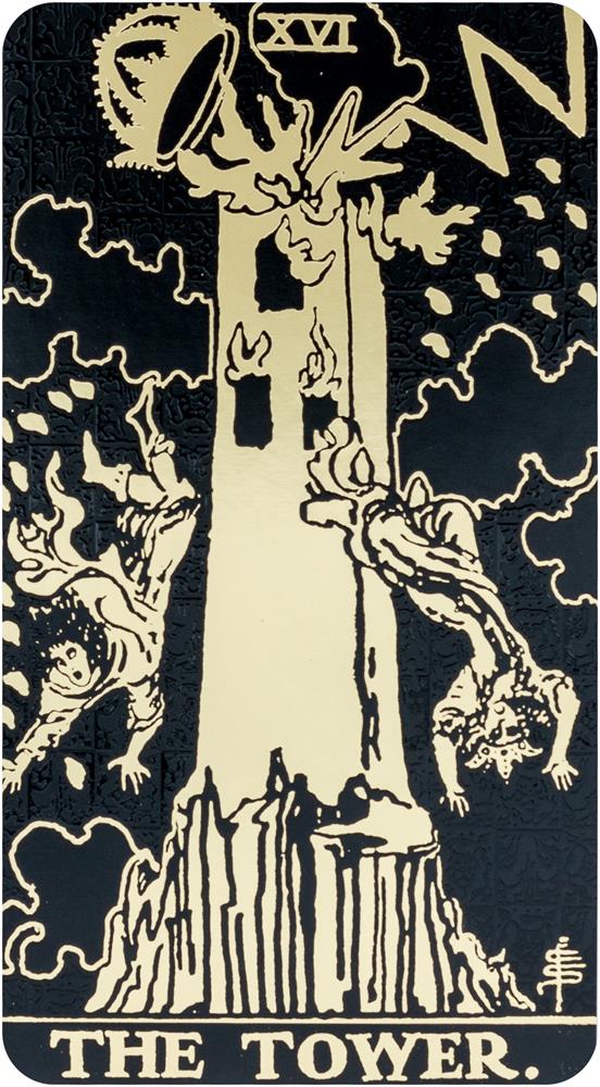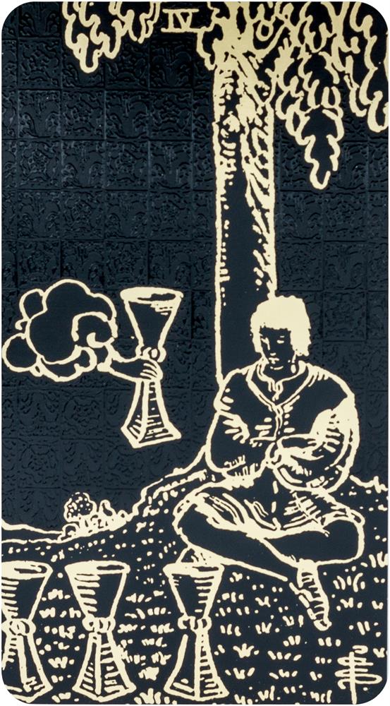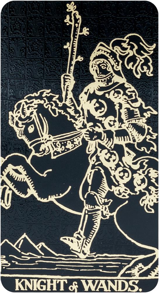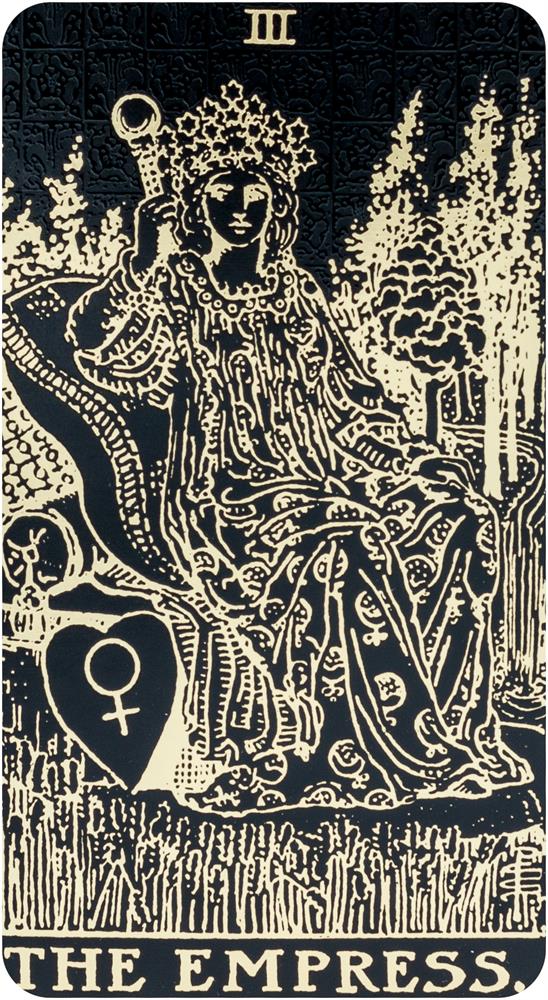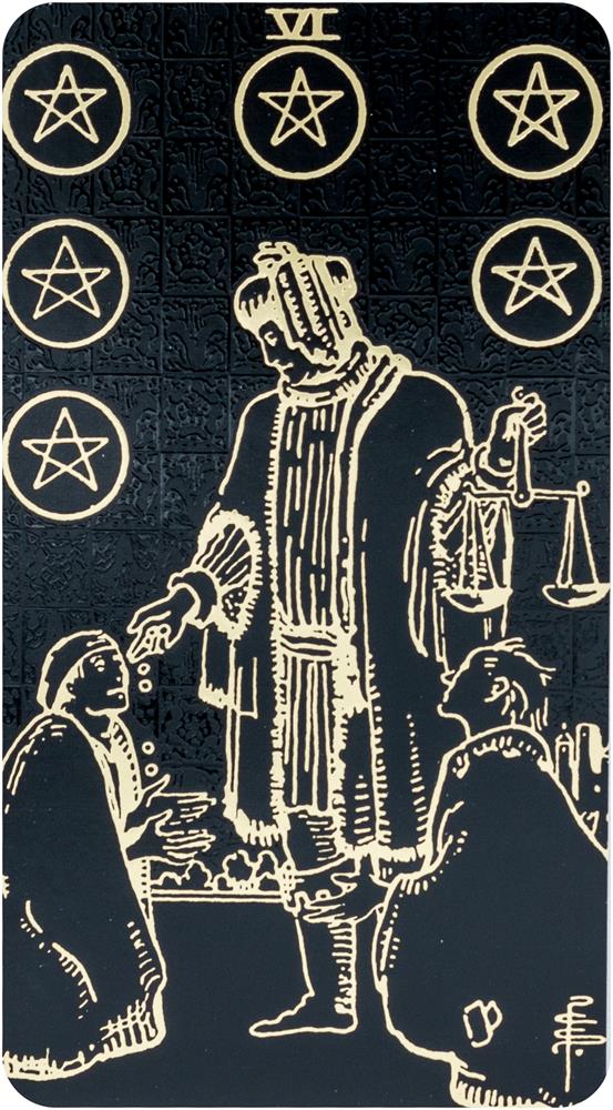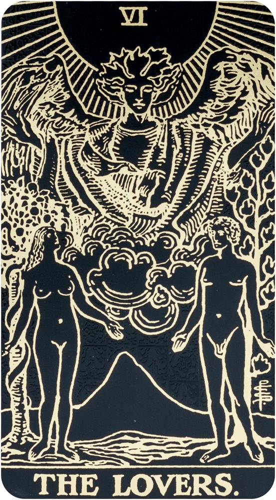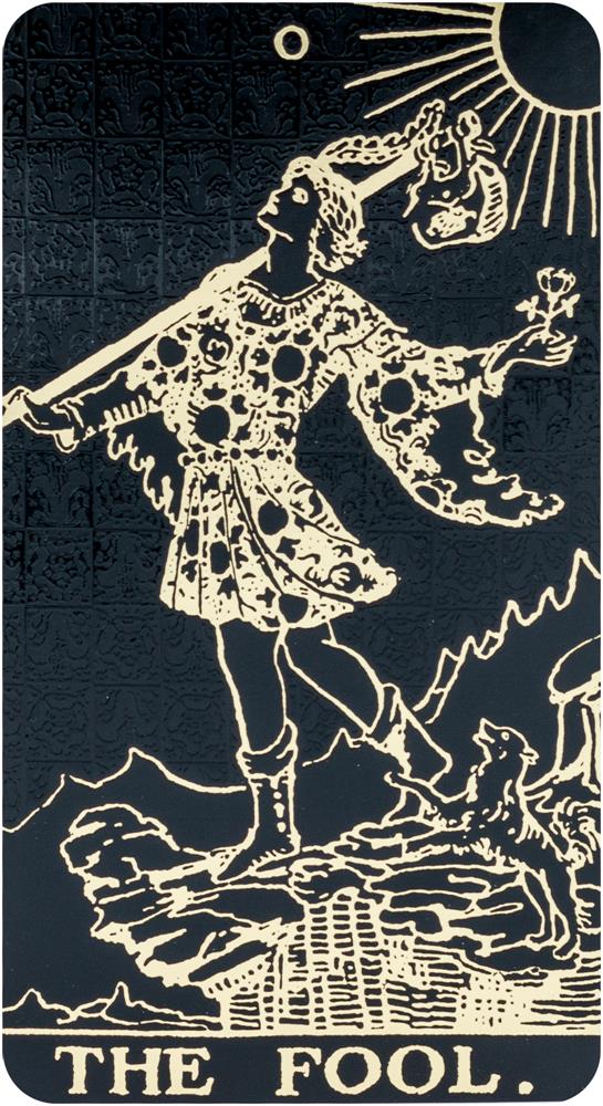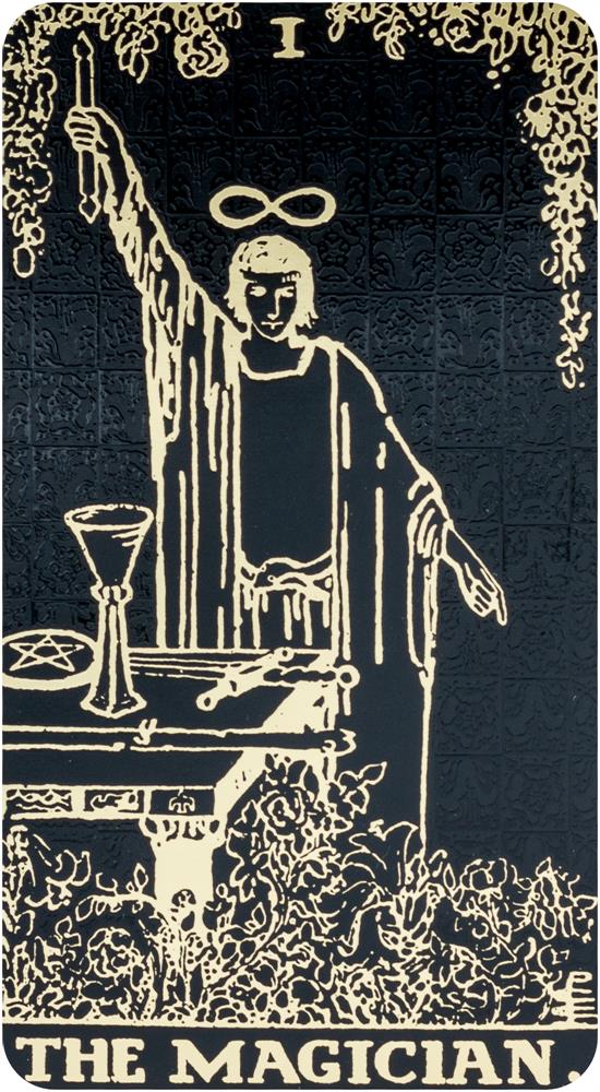 The Golden Universal Tarot is a re-printing of the Universal Tarot by Roberto de Angelis, a redrawn and more dynamic version of the Rider-Waite. This edition has selected symbols and imagery decorated with gold foil on its 78 cards.