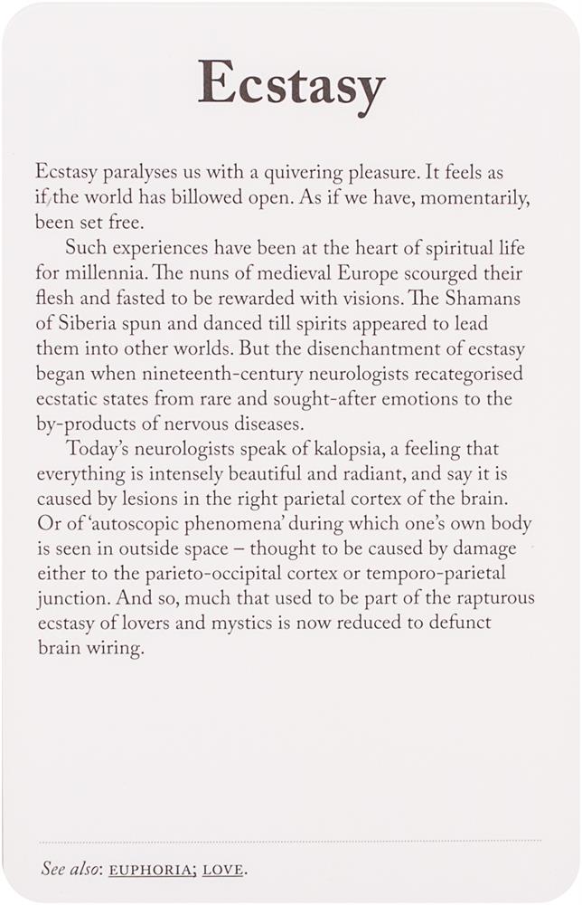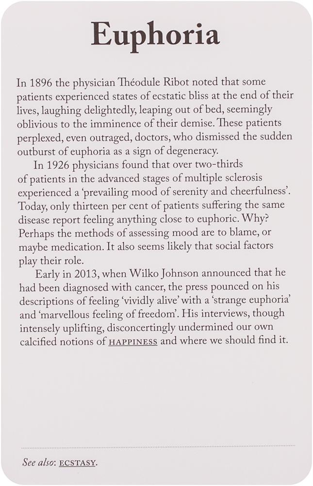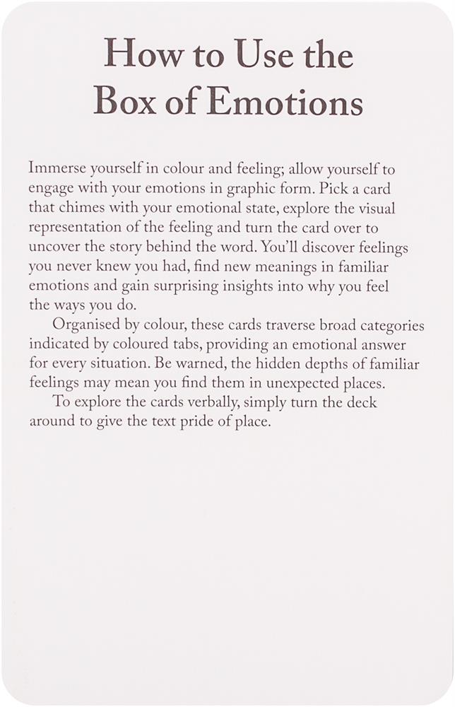 Dip into the Box of Emotions to find the perfect expression of how you feel. Each of the 80 cards contains a mini-essay on a different emotion on one side and a mesmerizing colour pattern on the other. Learn more about yourself and what makes your fellow beings tick, from anger and worry to empathy and courage. And with a host of less familiar emotions – dépaysement, fago, and litost among them – you may discover a whole new way of being.