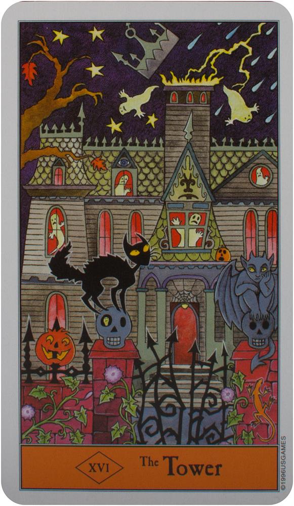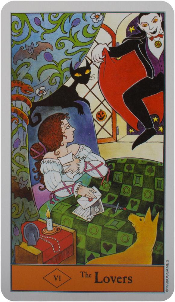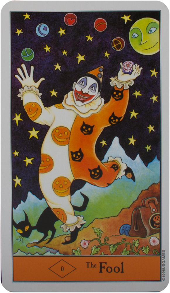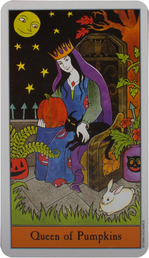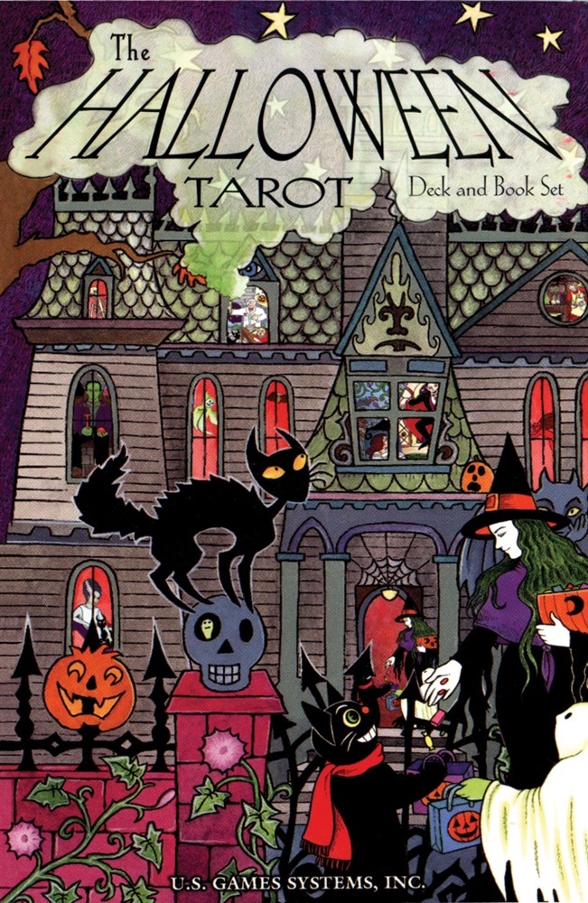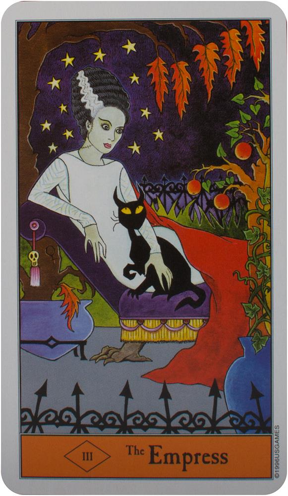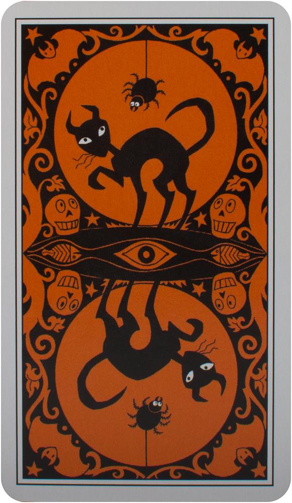 A black cat with glowing eyes leads us on our nocturnal sojourn through the 78 cards of the Major and Minor Arcana. The characters of the Major Arcana visit from the realms of horror stories and Halloween tradition. Frankenstein and his bride 'bring to life' the Emperor and the Empress cards. The Minor Arcana suits are Pumpkins, Imps, Ghosts, and Bats, each with a special significance.