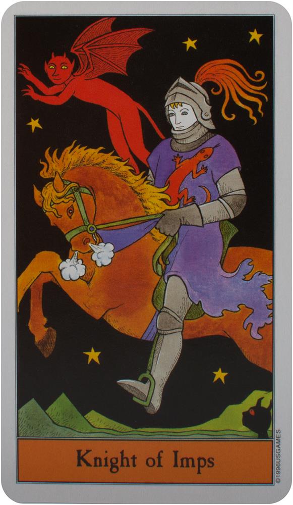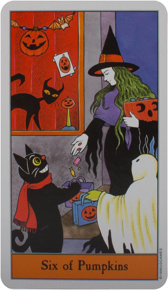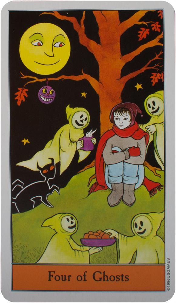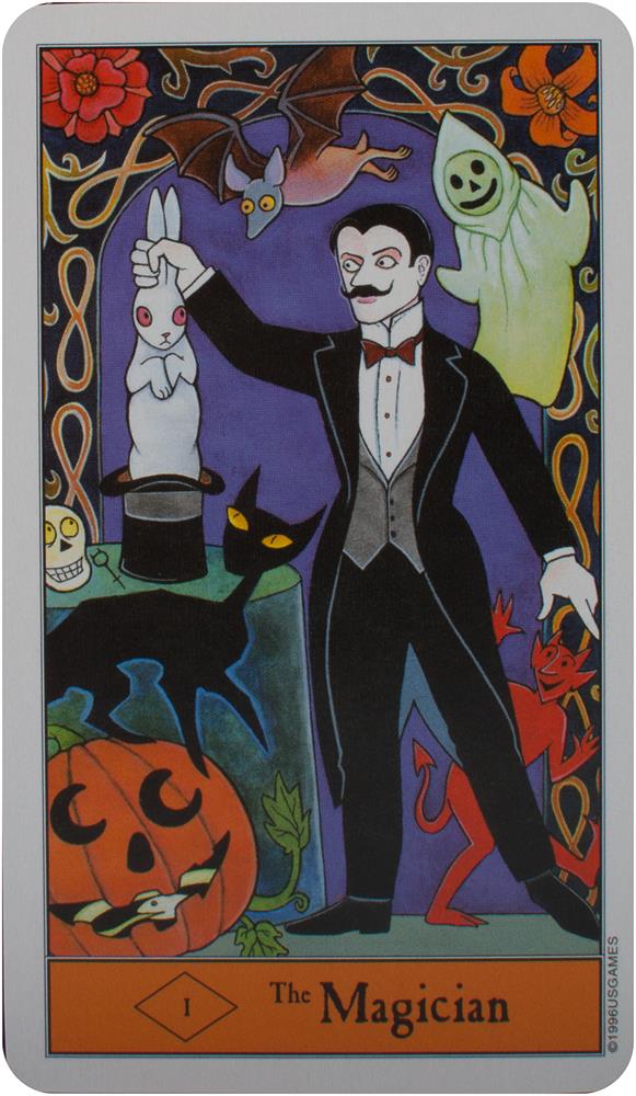 "As the suit of the ancient element Earth, the Pumpkins describe all things that are physical and tangible, real and solid -- things you can taste and smell, and of course, count. The Ghost cards are haunted by the ancient element of Water, the symbol of the fluidity of the subconscious mind, dreams, instincts, and emotions. The Bats comprise the 'thinking suit,' reflecting a bat version of the intellect -- the uncannily sensitive 'radar' of these nocturnal creatures that helps them find food and avoid collisions even on the blackest of Halloween nights. Since the traditional Tarot suit of Wands is linked with the ancient element Fire, the devilish scarlet Imps make a delightful Halloween suit equivalent."