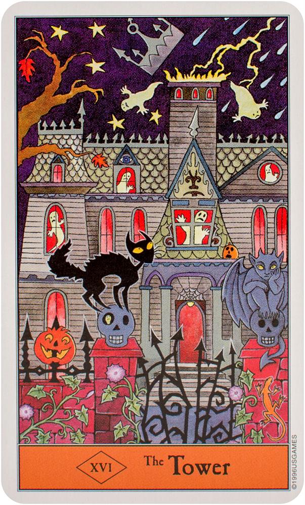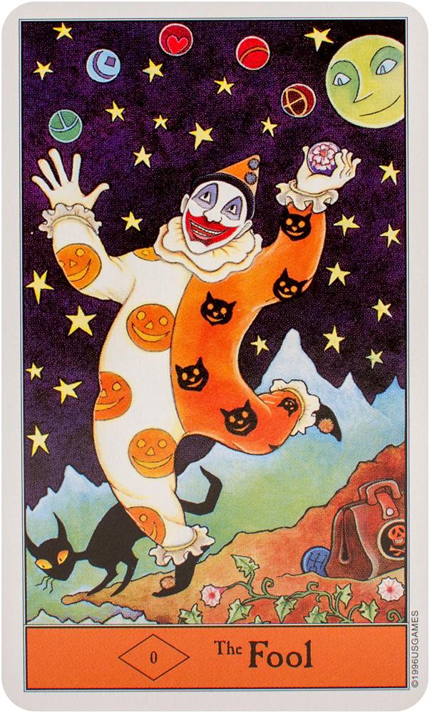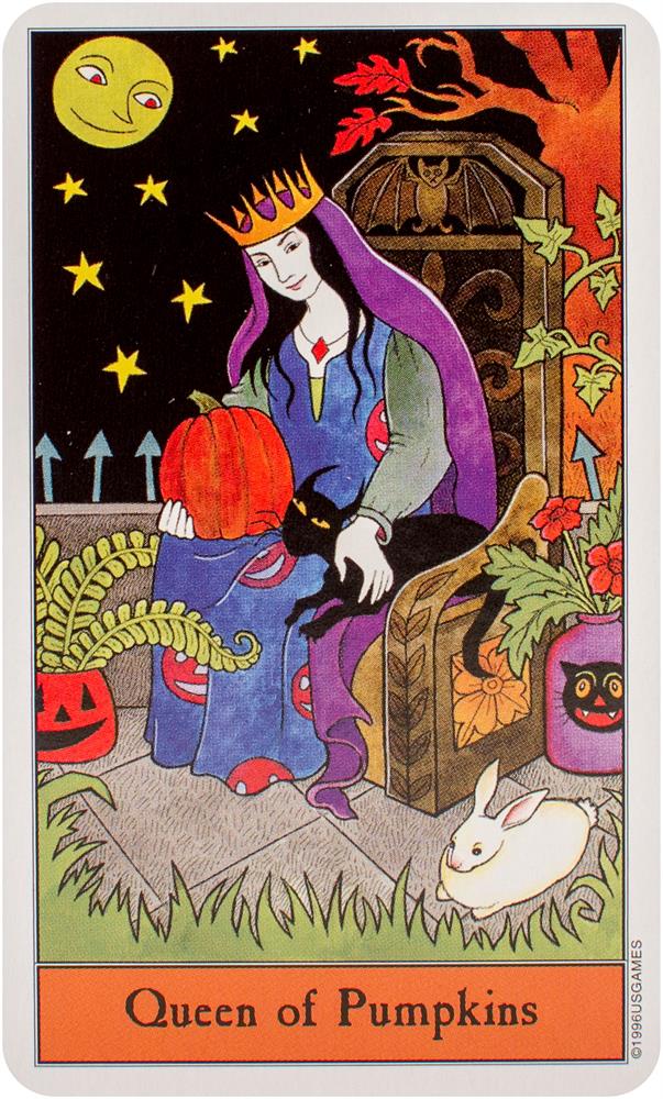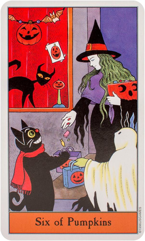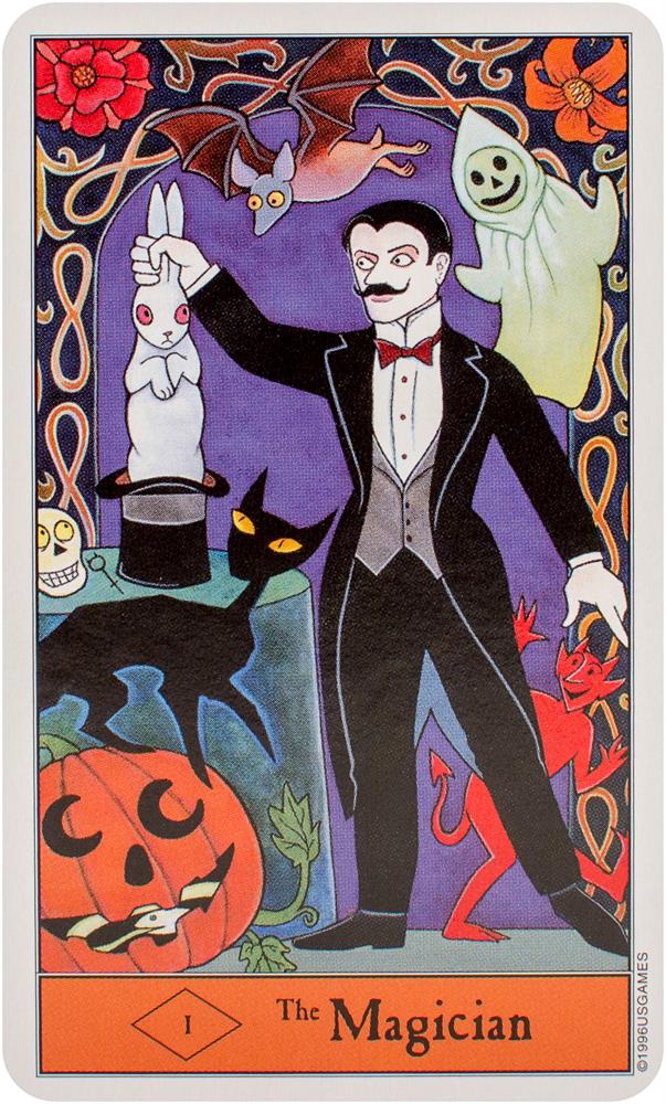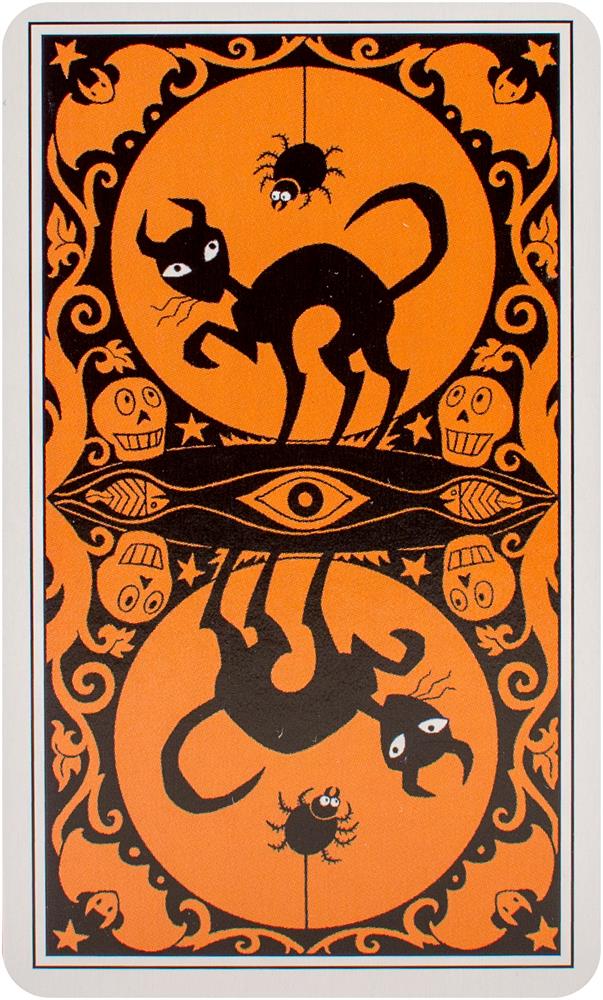 Follow the black cat through the Halloween Tarot! The artwork conjures up all that's fun about Halloween. The Minor Arcana suits are Pumpkins, Imps, Ghosts, and Bats.