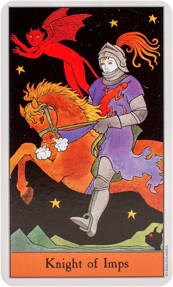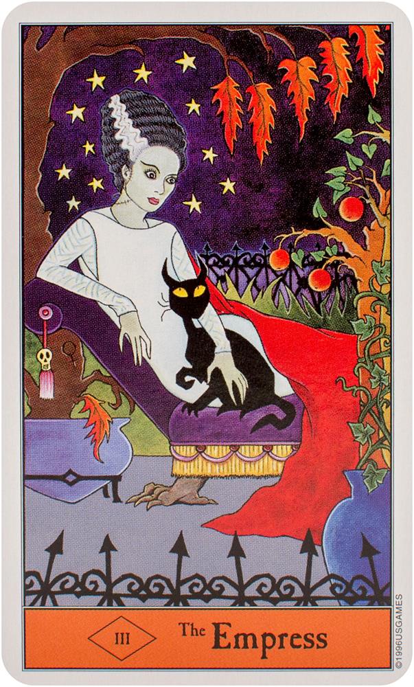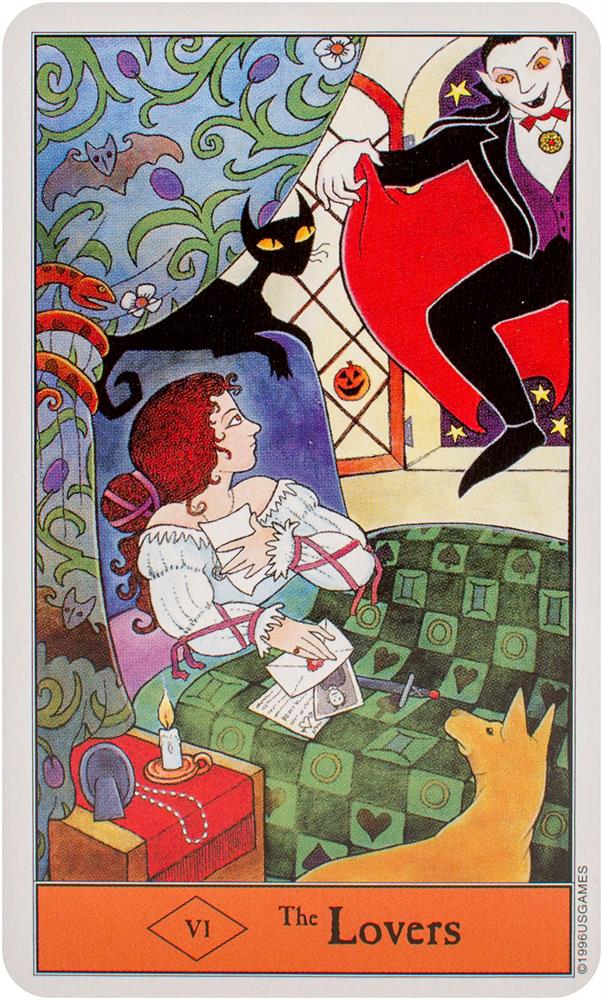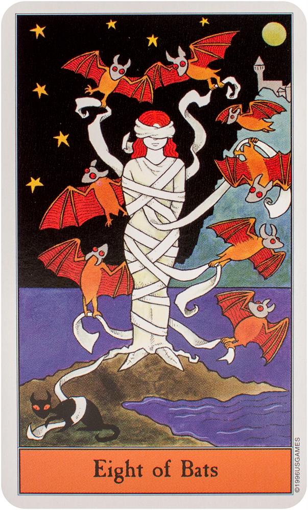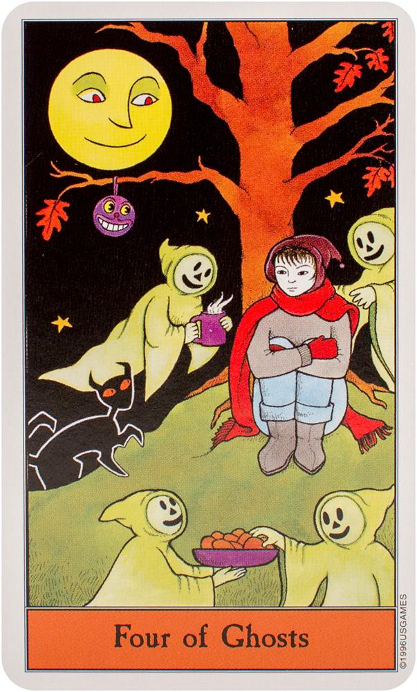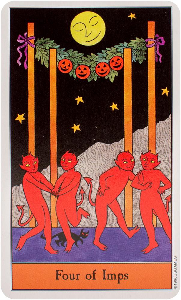 Follow the black cat through the Halloween Tarot! The artwork conjures up all that's fun about Halloween. The Minor Arcana suits are Pumpkins, Imps, Ghosts, and Bats.