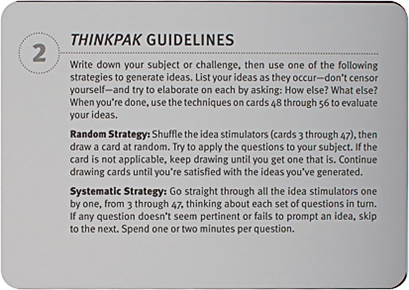 Looking for a unique invention, an untapped market for an existing product, or a new solution? Stretch and flex your mental muscles with Thinkpak, a creative-thinking tool designed by Michael Michalko, author of the groundbreaking book Thinkertoys. This deck of illustrated idea-stimulating cards distills Michalko’s proven methods, allowing you to view challenges in a new light. Shuffle, mix, and match the cards to spark fresh insights, then use the critical evaluation techniques to test, shape, and refine your original ideas into realistic creations. Filled with thought-provoking questions and examples of the techniques put to use, Thinkpak provides endless creative fuel to fire up the imagination.