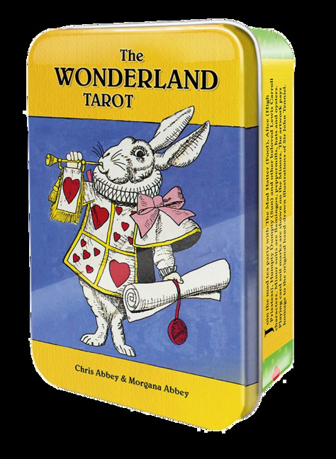 Join the mad tea party with the beloved characters of Lewis Carroll in The Wonderland Tarot, including The Mad Hatter (Fool), Alice (High Priestess), Humpty Dumpty (Sun), the White Rabbit (Judgement) and all the others. The delightful artwork by Morgana Abbey pays homage to the hand-drawn Victorian style of Sir John Tenniel, illustrator of the first edition of Alice's Adventures in Wonderland. In this whimsical tarot deck the Minor Arcana suits are flamingos for Swords, peppermills for Staves, hats for Cups and oysters for Coins. In the spirit of the Alice books, as a nod to the Queen of Hearts, playing card suit marks are included on the Minor Arcana cards, so this deck may be used for traditional card games as well as tarot readings. This pocket-sized deck comes in a tin with a 56-page booklet.Note from Chris Abbey and Morgana Abbey 2016: “A lot changes over the years, and this deck remains a happy memory for us. If you knew it from before, we hope seeing it again brought you a grin, Cheshire Cat-like or not. If you are encountering this for the first time, we hope to match the grin. Thank you for all before and for all that is to come."